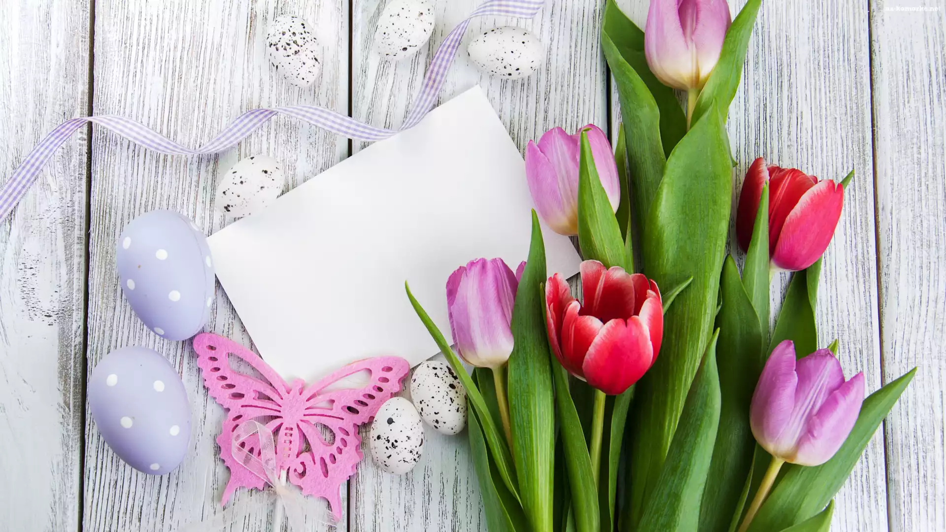 Wstążka, Wielkanoc, Tulipany, Pisanki, Motylek na Komórkę
