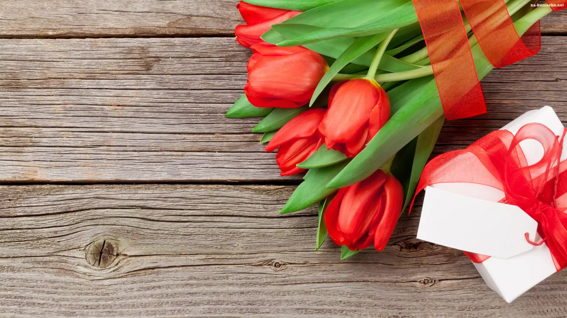 Wstążka, Tulipany, Czerwone, Deski, Prezent, Bilecik na Komórkę