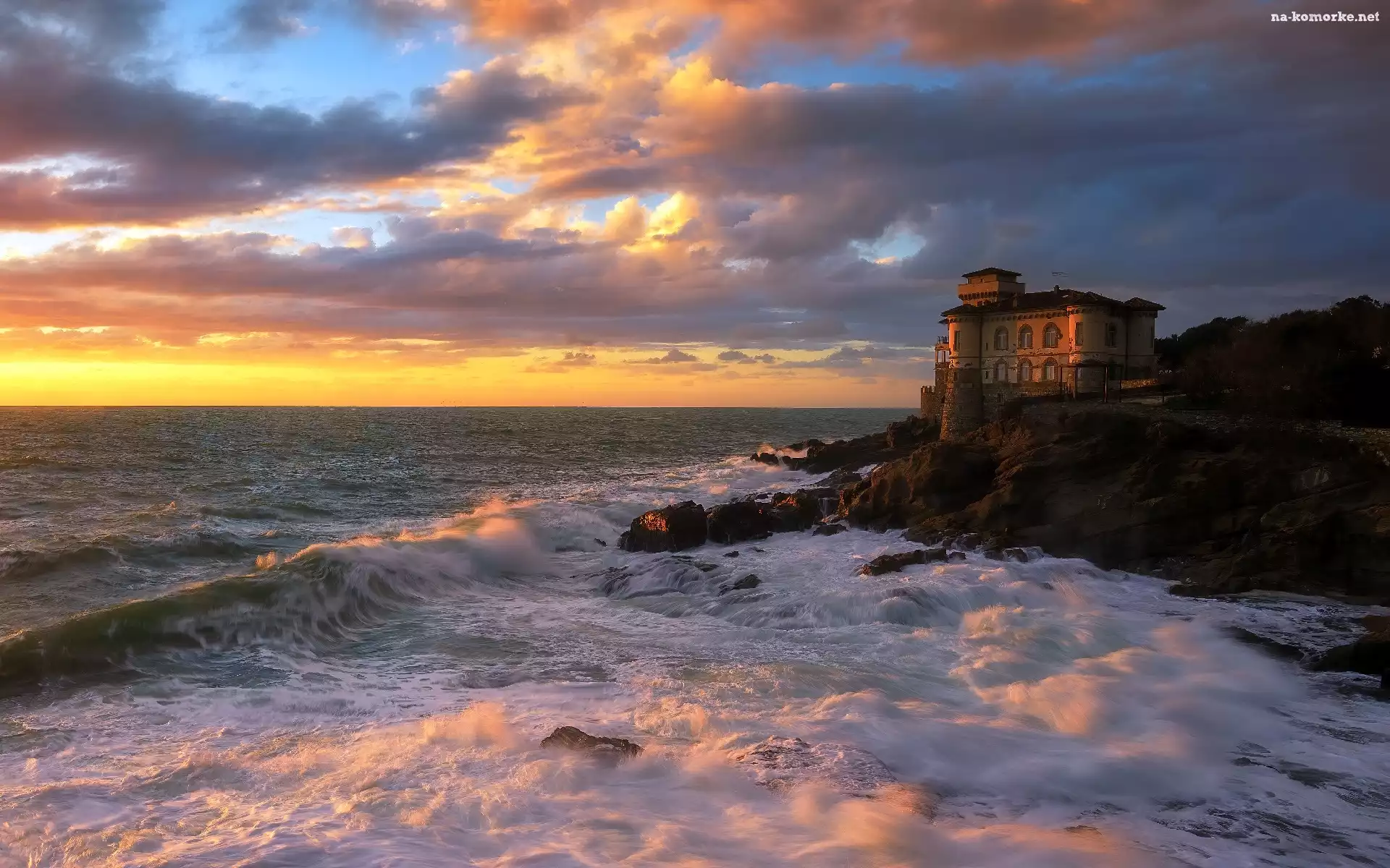 Gmina Livorno, Włochy, Skały, Wybrzeże Antignano, Zachód słońca, Toskania, Morze Liguryjskie, Kamienie, Zamek Boccale na Komórkę |
