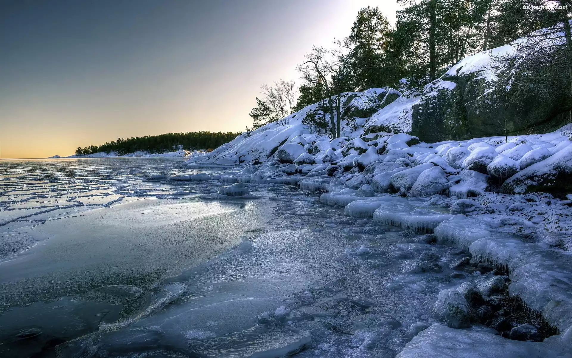 Wybrzeże, Zima, Skały, Lasy na Komórkę