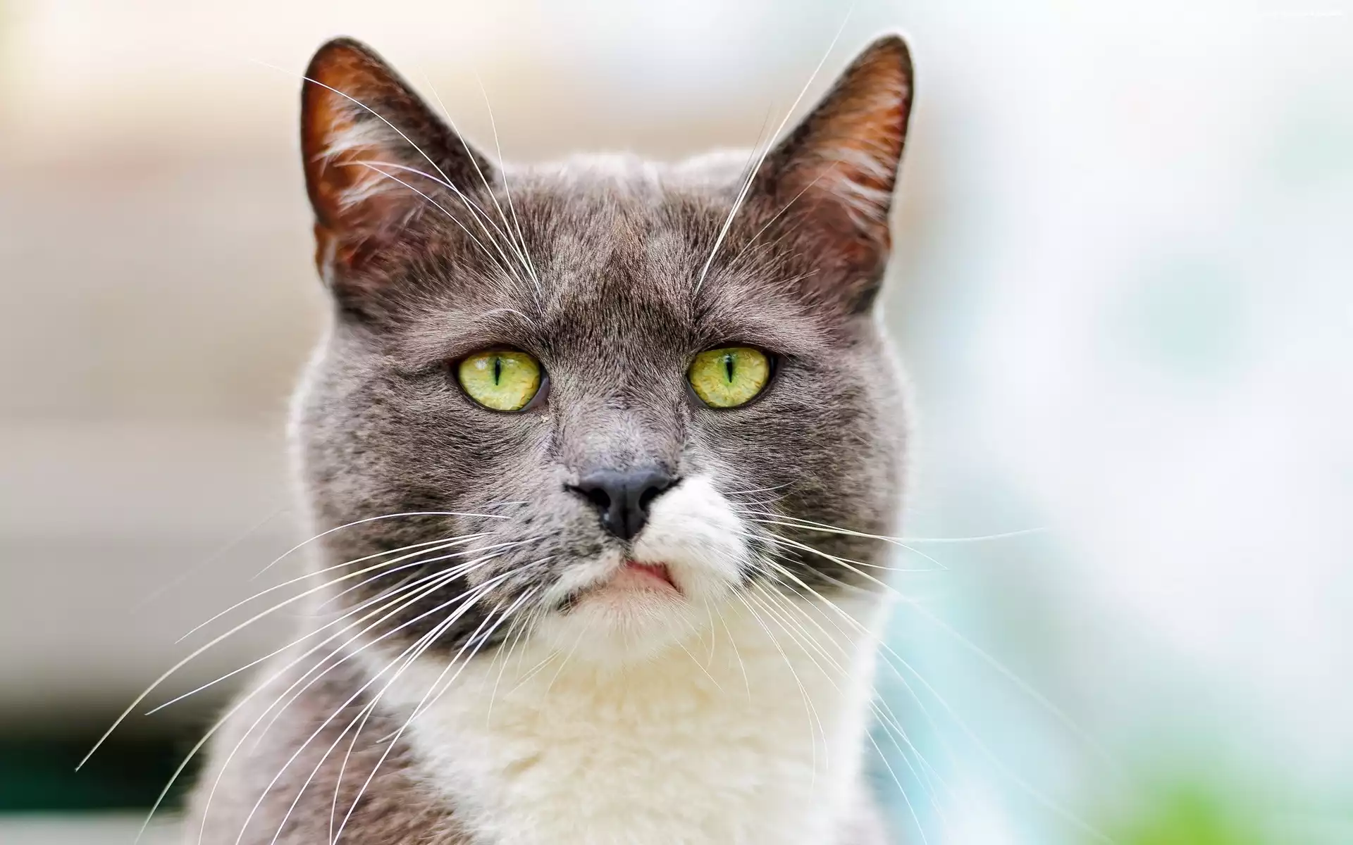Szaro, Wykrzywiony, Pyszczek, Biały, Kot, Zielone, Oczy na Komórkę