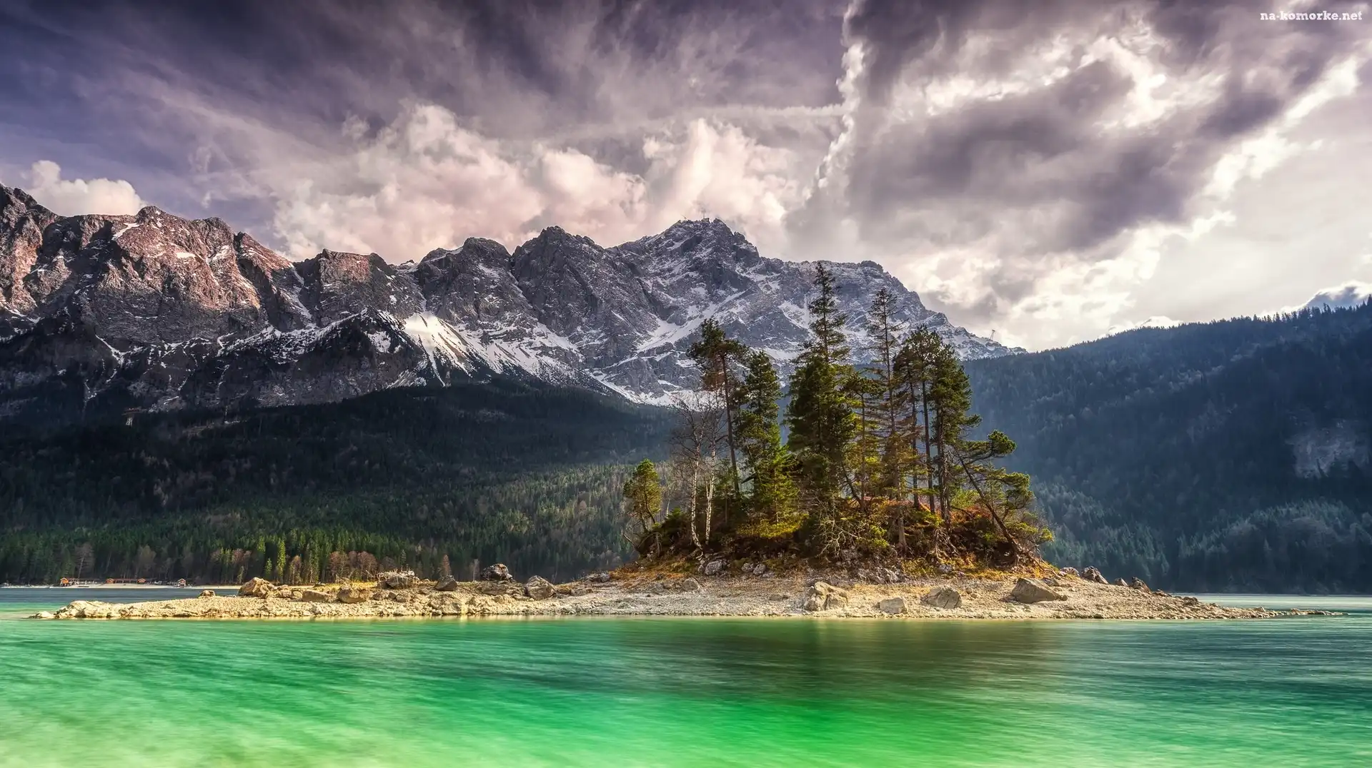 Wysepka, Jezioro, Góry, Drzewa, Chmury na Komórkę