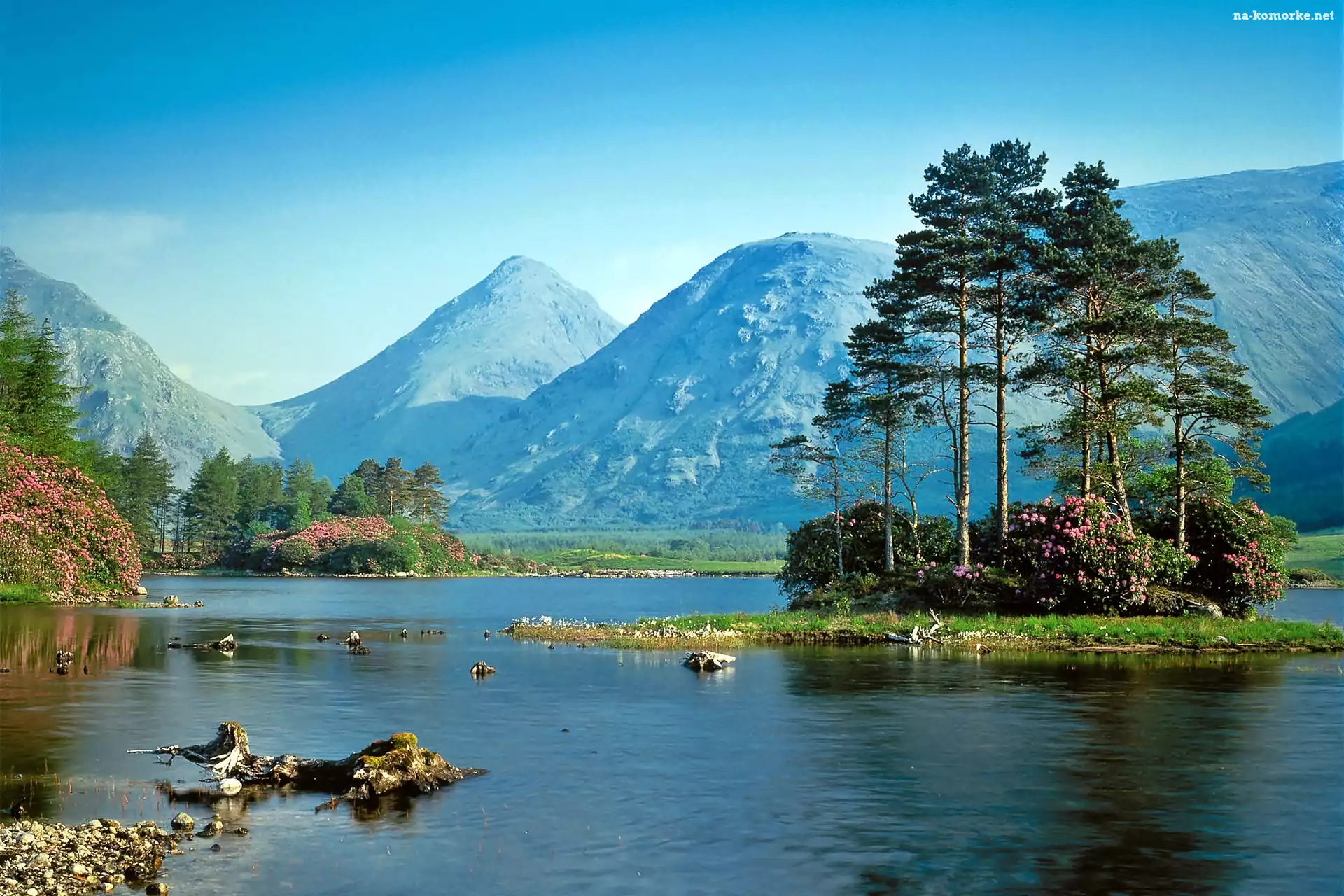 Wysepka, Lasy, Góry, Rododendrony, Jezioro, Sosny na Komórkę
