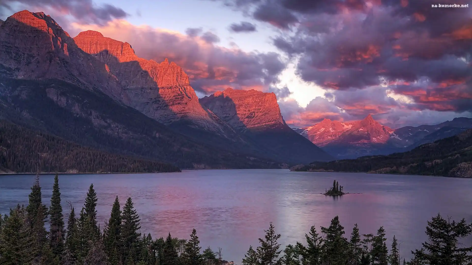 Wysepka, Chmury, Rozświetlone, Szczyty, Jezioro na Komórkę