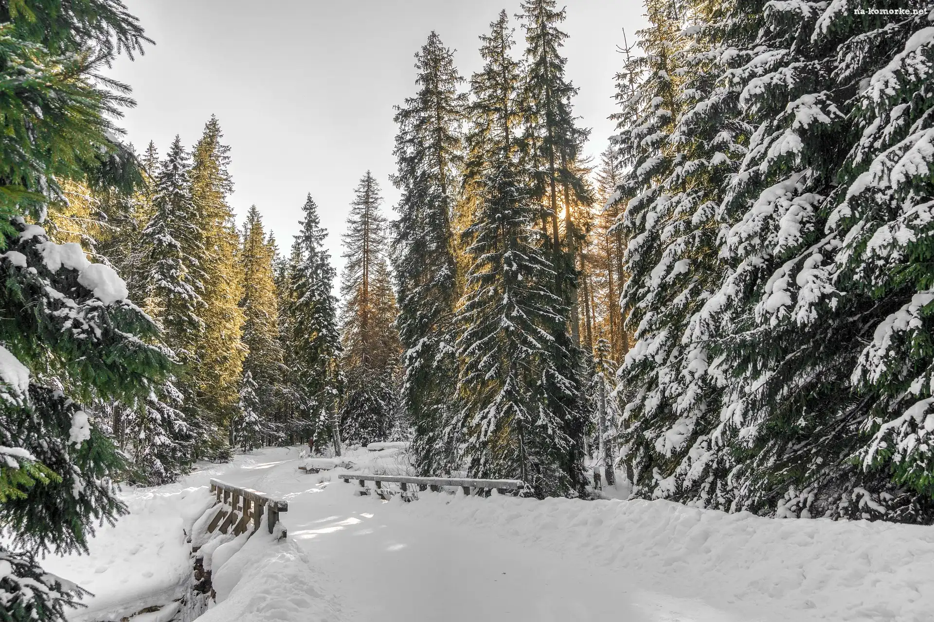 Las, Wysokie, Zima, Słoneczny blask, Drzewa, Mostek na Komórkę