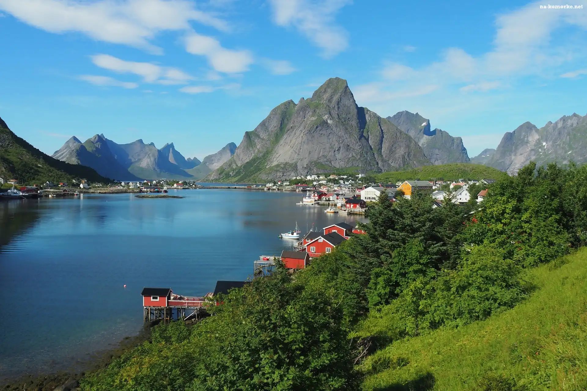Norwegia, Góry, Wyspa Moskenesoya, Drzewa, Lofoty, Wioska Reine, Morze Norweskie, Domy na Komórkę