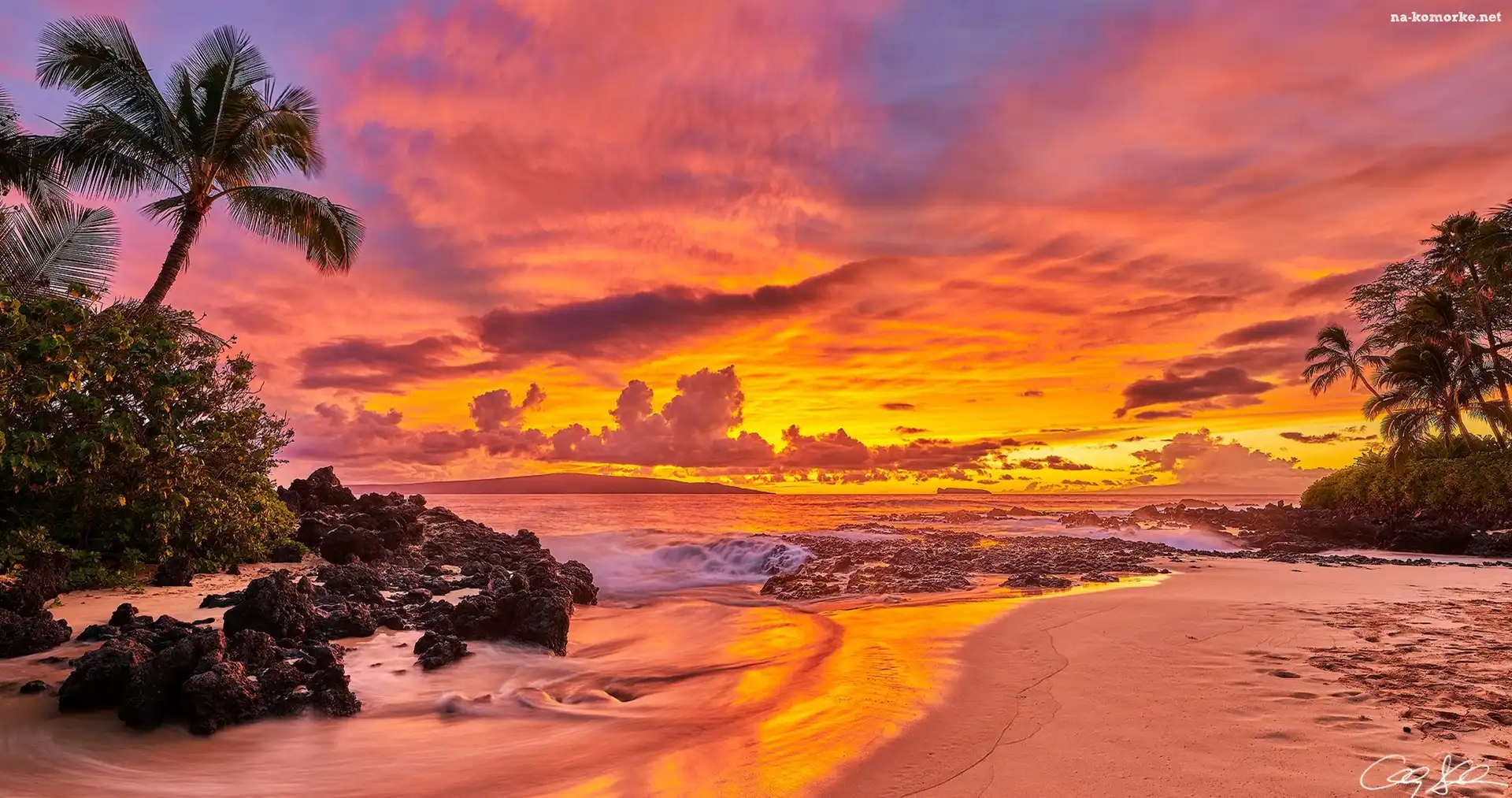 Palmy, Wyspa Maui, Hawaje, Chmury, Ocean, Zachód słońca na Komórkę
