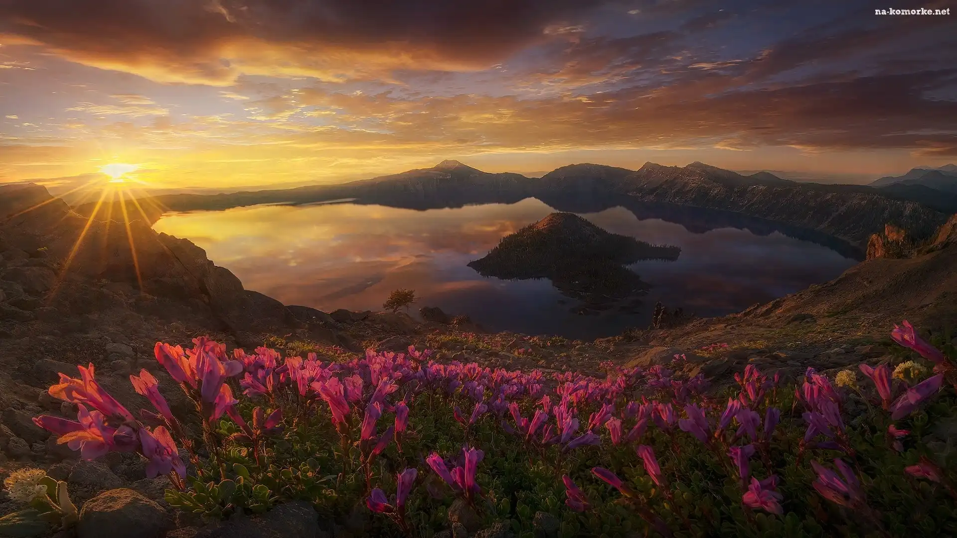 Stany Zjednoczone, Promienie słońca, Wyspa Czarodzieja, Kwiaty, Stan Oregon, Jezioro Kraterowe, Góry, Zachód Słońca na Komórkę |