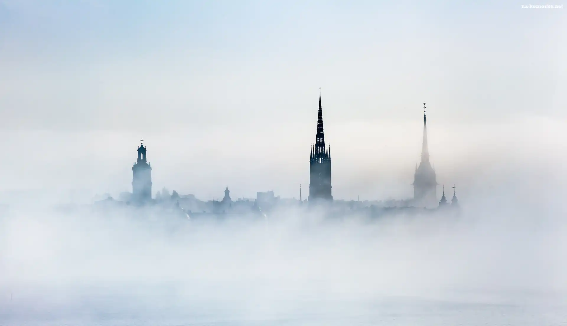 Wieże, Wyspa Riddarholmen, Sztokholm, Mgła, Kościół, Chmury na Komórkę