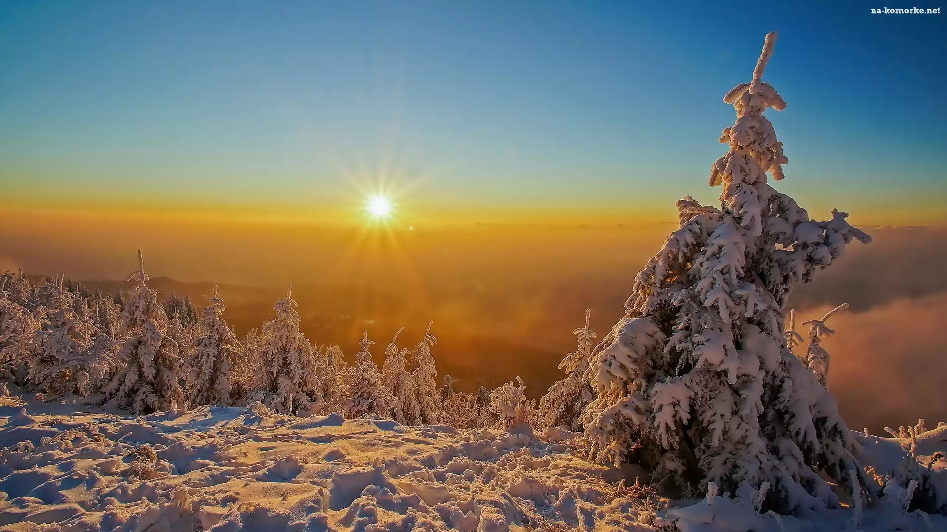 Drzewa, Wzgórza, Zima, Wschód słońca, Ośnieżone, Śnieg na Komórkę