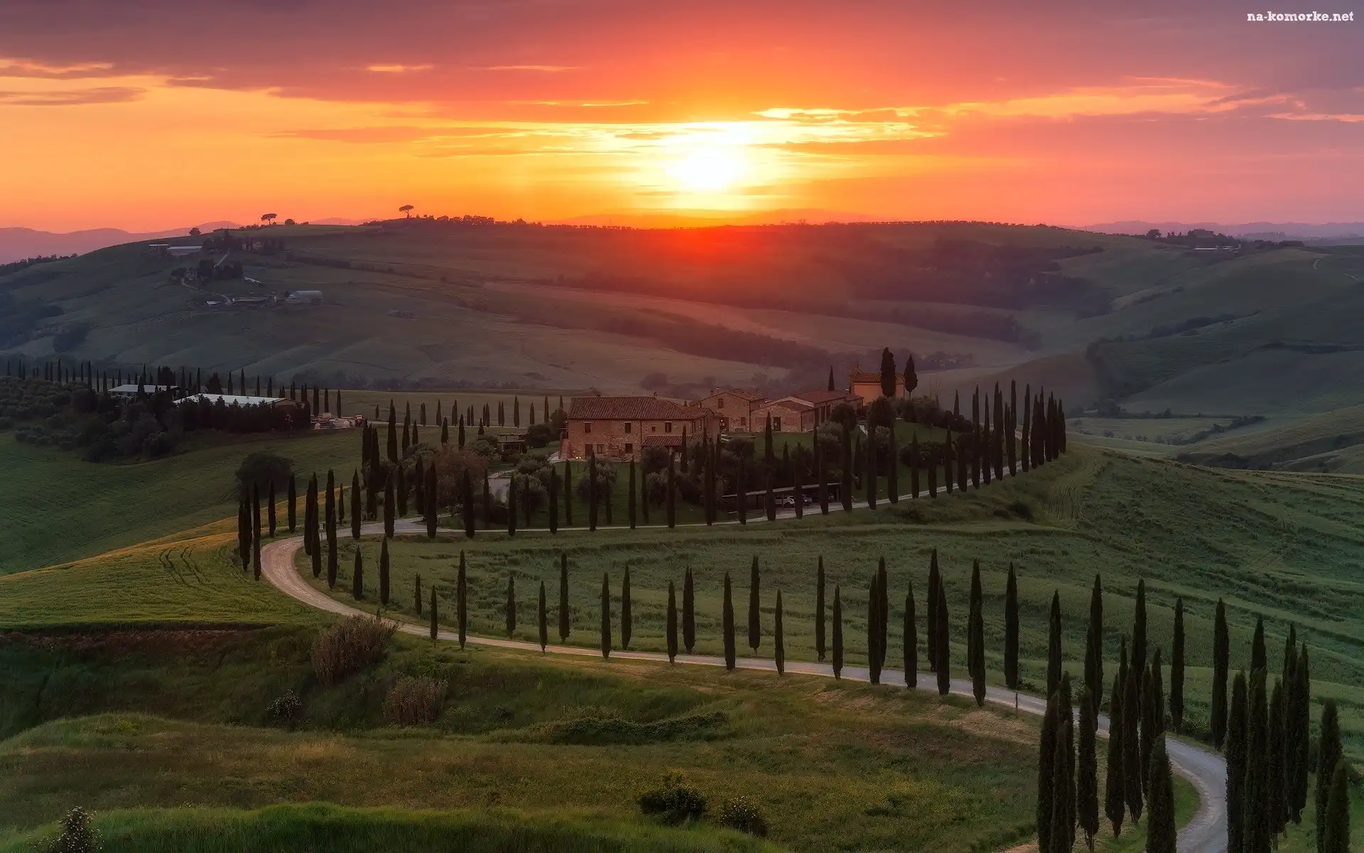 Domy, Toskania, Drzewa, Włochy, Droga, Cyprysy, Zachód słońca, Wzgórza na Komórkę