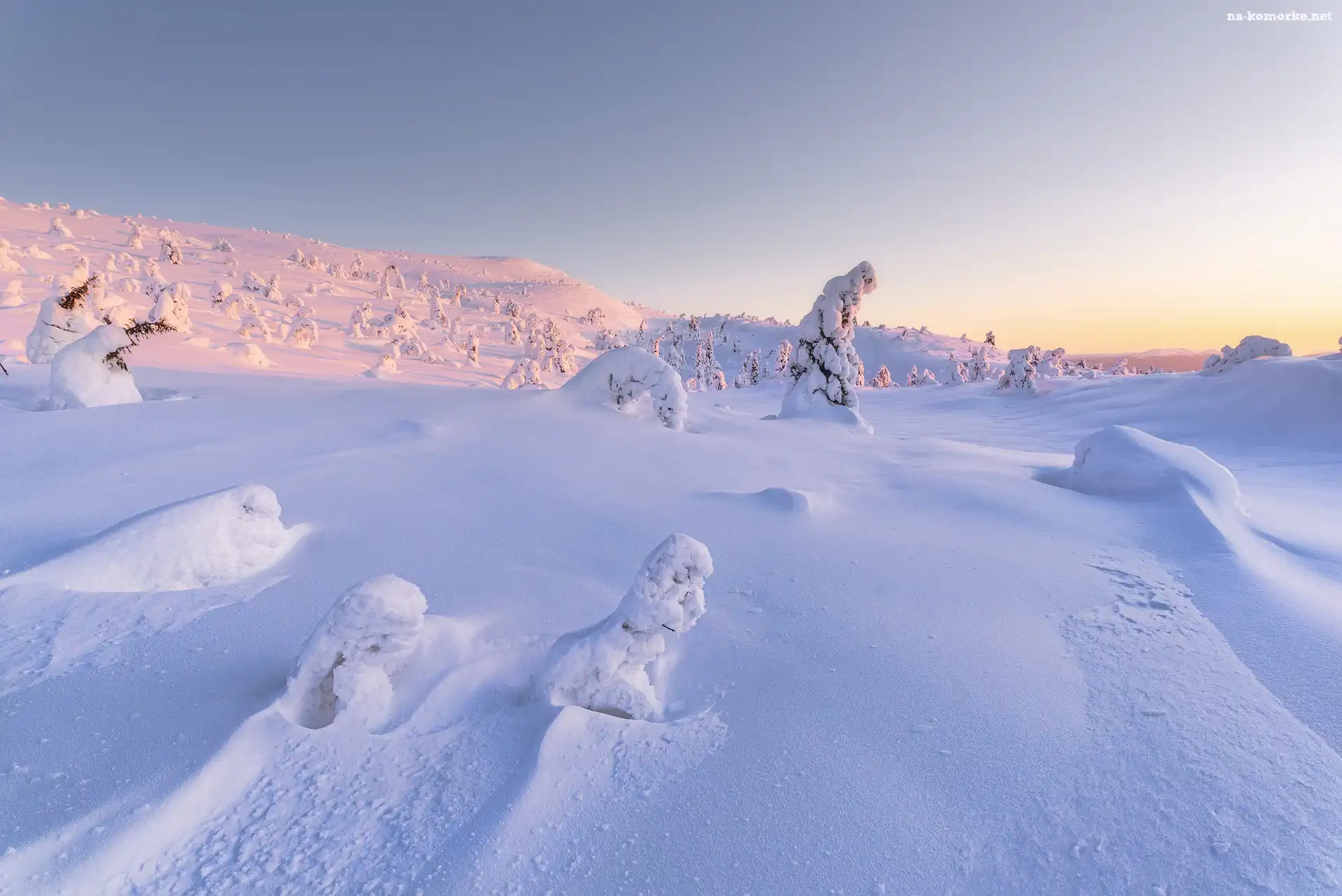 Wzgórza, Zima, Zaśnieżone, Drzewa, Góry na Komórkę