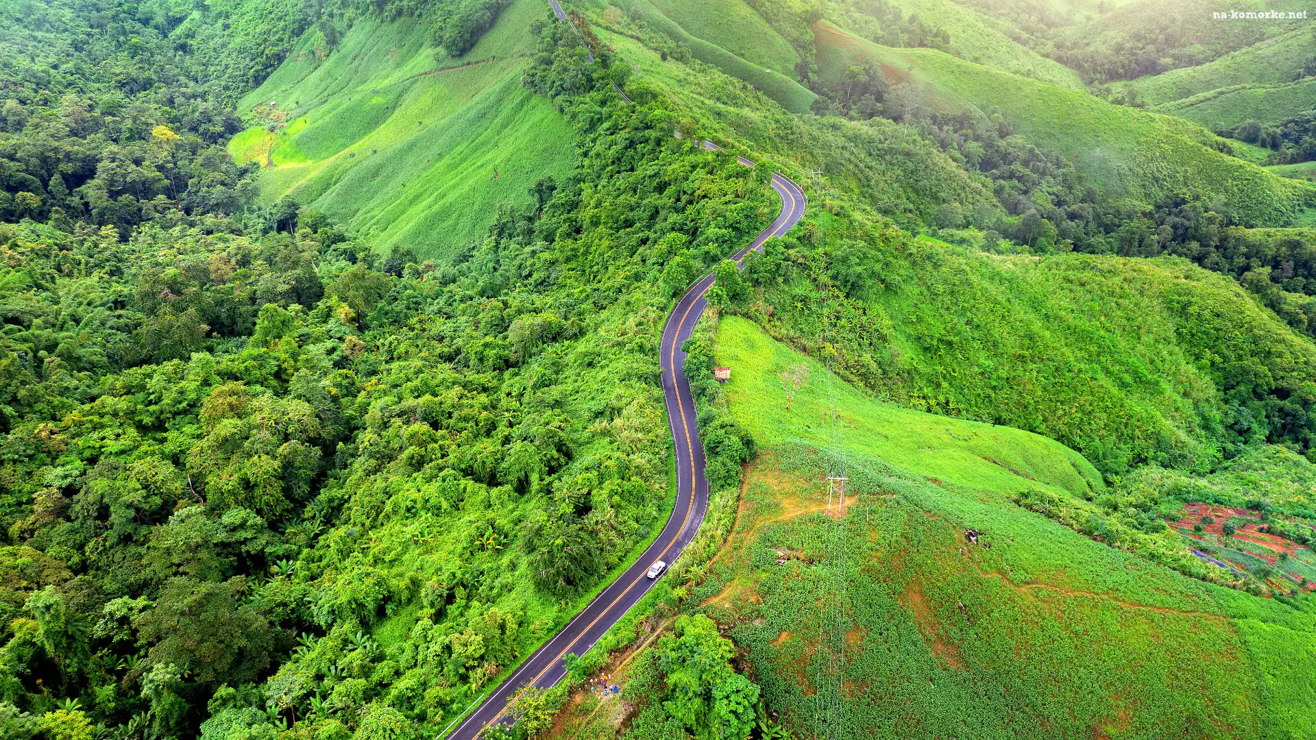 Z lotu ptaka, Prowincja Nan, Tajlandia, Droga, Drzewa, Zielone, Wzgórza na Komórkę