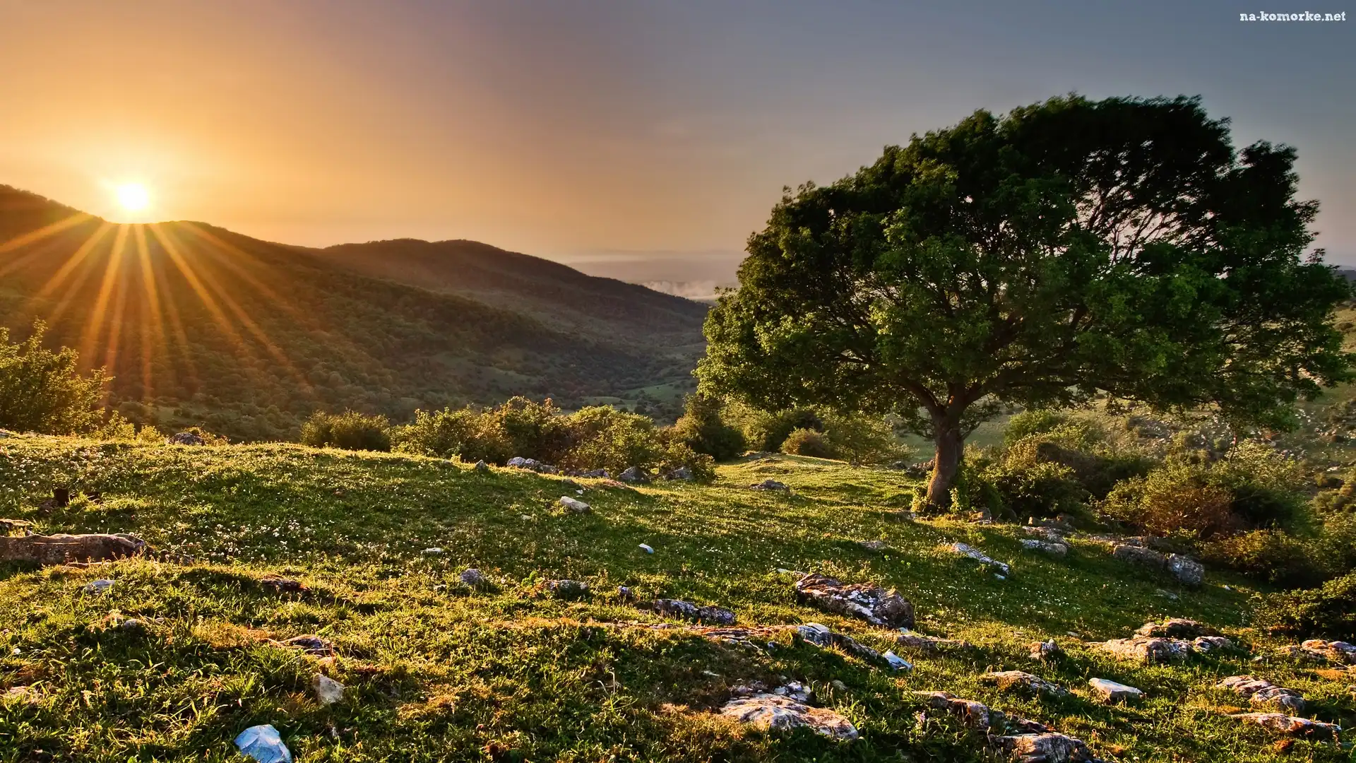 Wzgórza, Promienie, Drzewa, Wschód Słońca na Komórkę