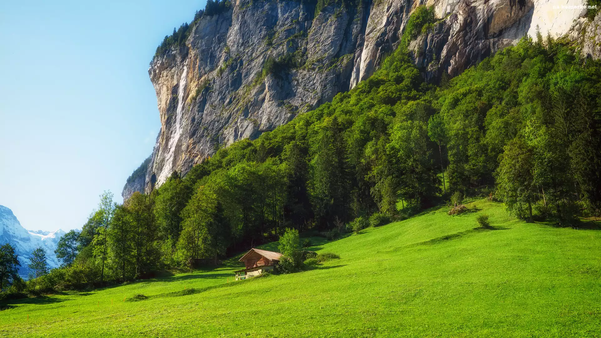 Drzewa, Dolina Lauterbrunnen, Polana, Szwajcaria, Góry, Dom, Wzgórze na Komórkę