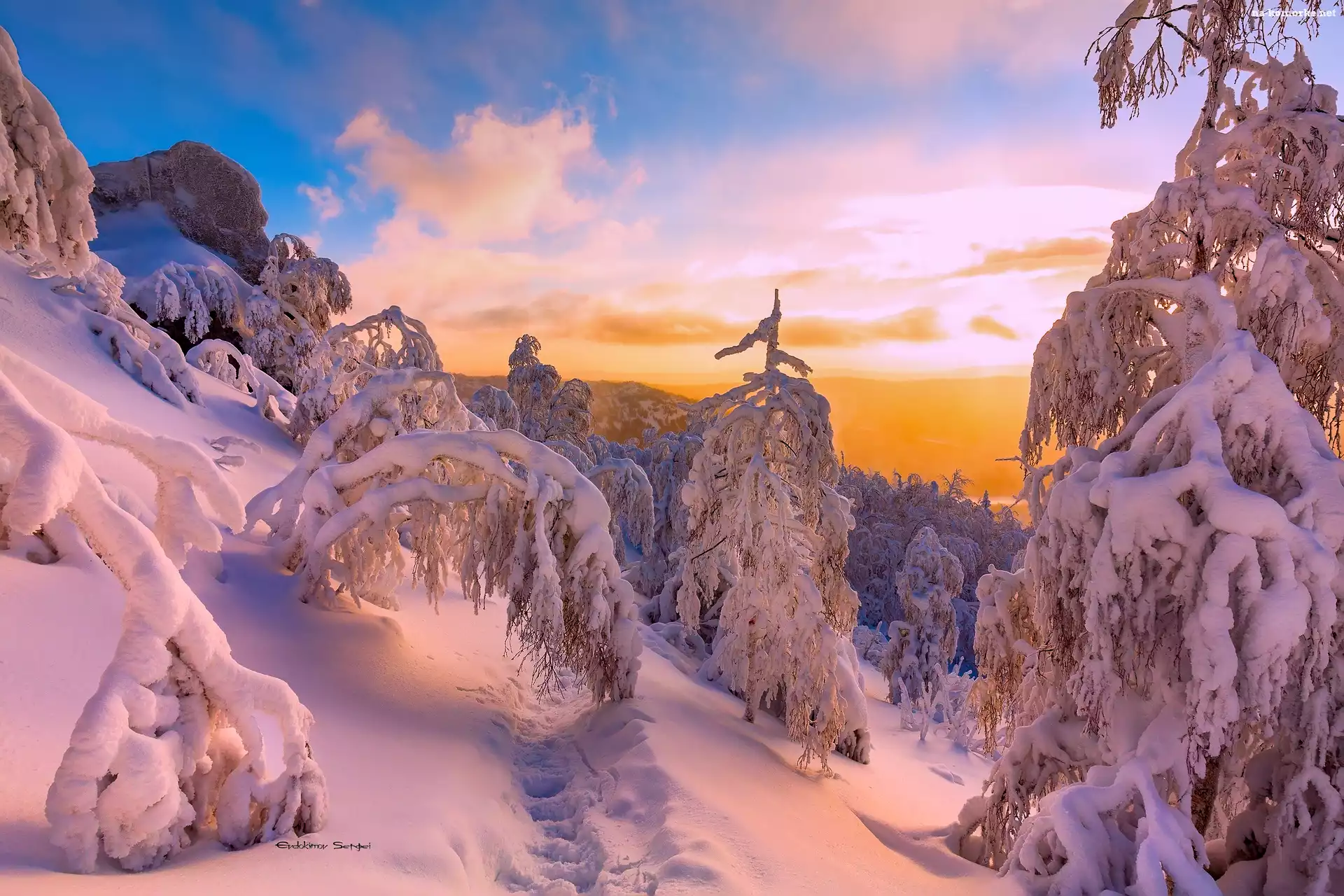 Drzewa, Ścieżka, Zima, Zachód słońca, Góry, Ośnieżone, Wzgórze na Komórkę