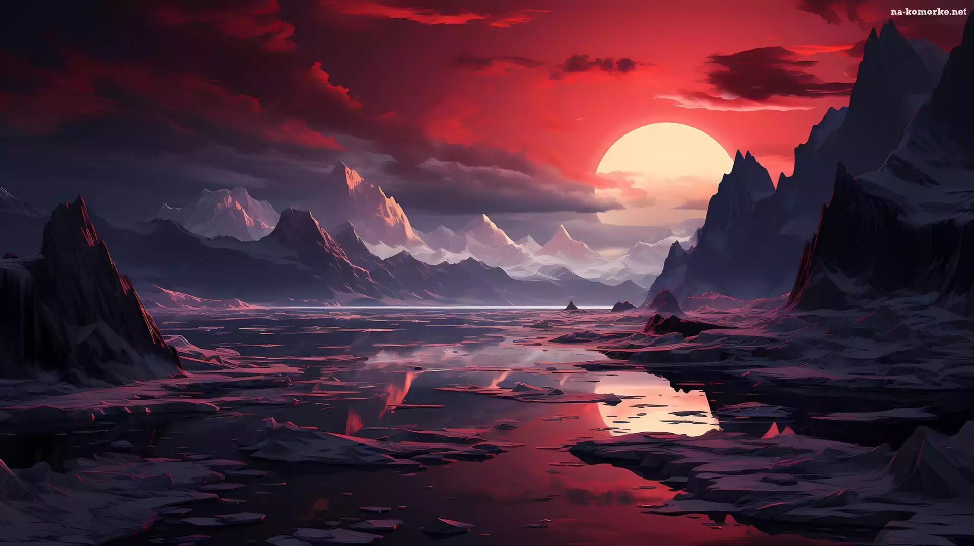 Góry, Niebo, Rzeka, Zachód słońca, 2D na Komórkę