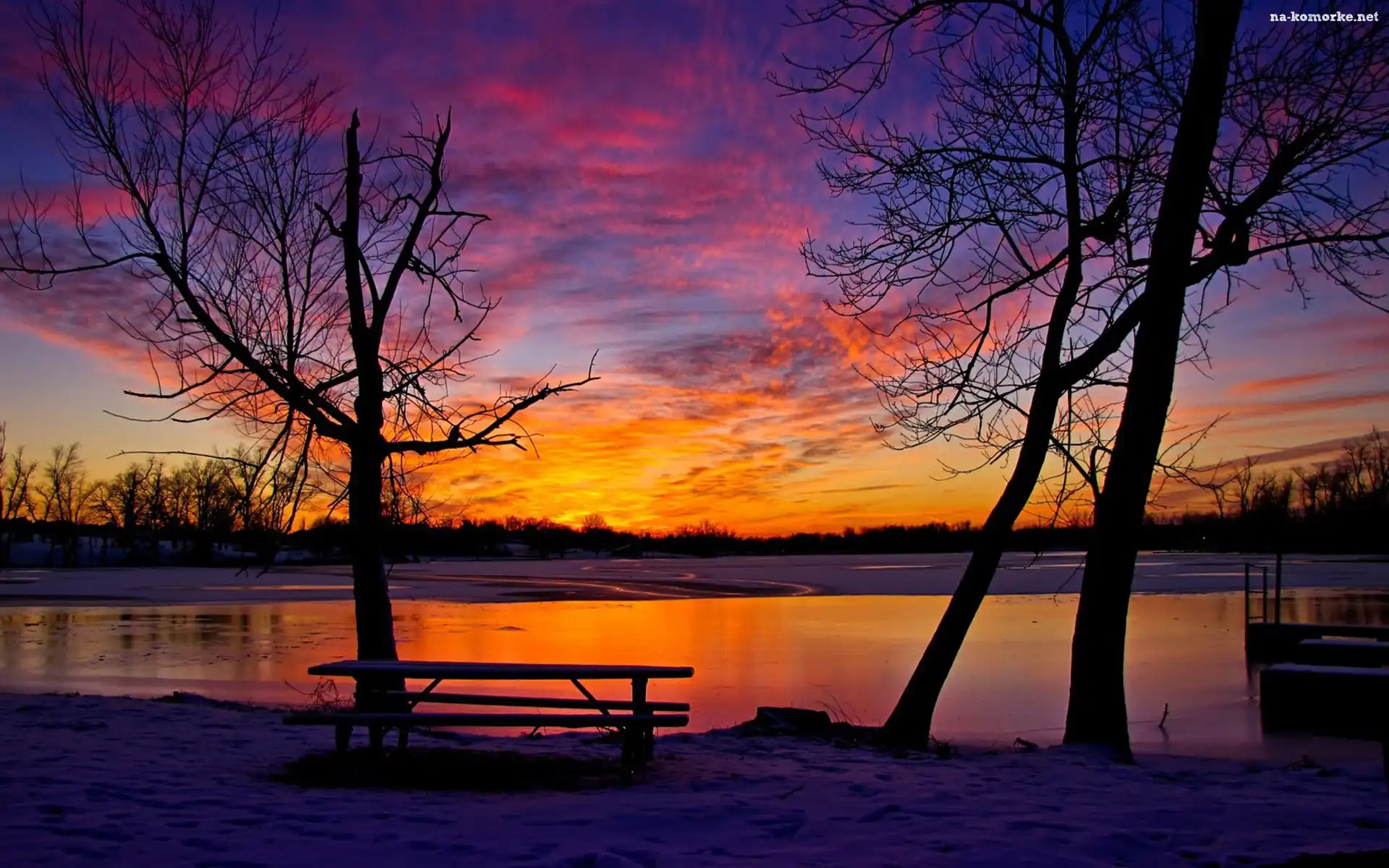 Zachód, Drzewa, Rzeka, Zima, Ławka, Słońca na Komórkę
