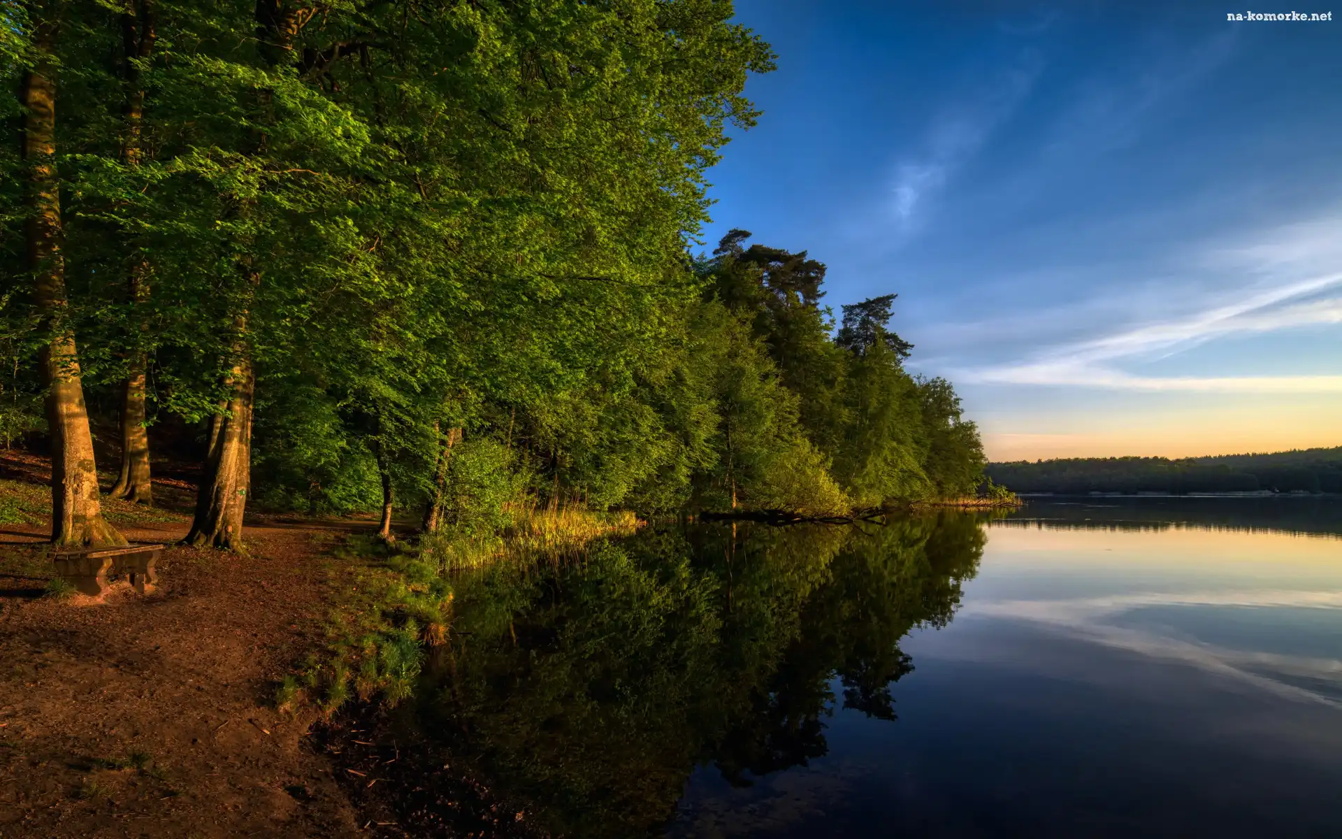 Zachód słońca, Zielone, Drzewa, Ławka, Jezioro na Komórkę