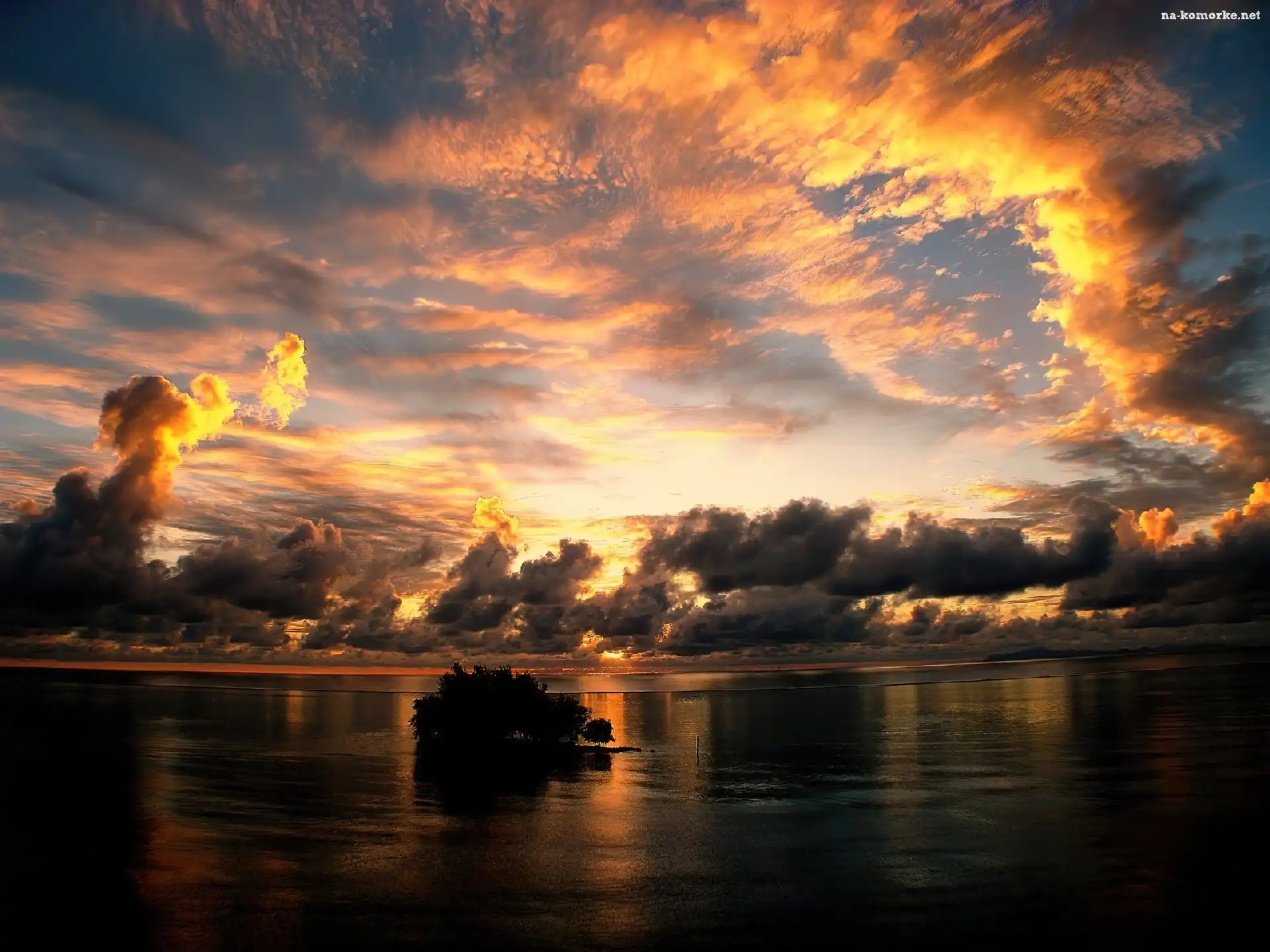Zachód, Wysepka, Ocean, Tahiti, Chmury, Słońca na Komórkę