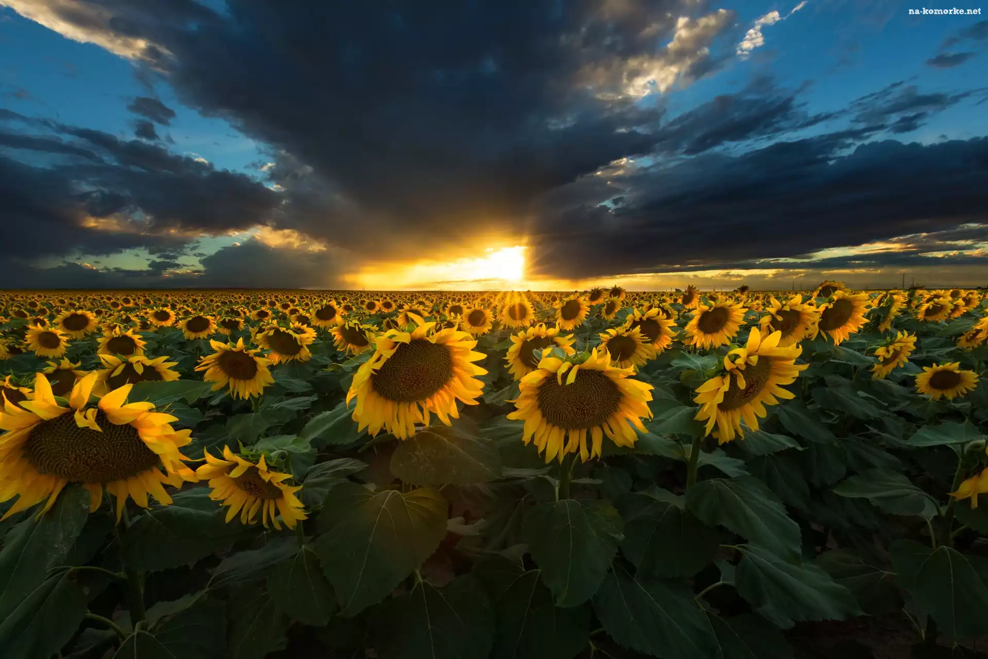 Zachód słońca, Plantacja, Chmury, Słoneczniki na Komórkę