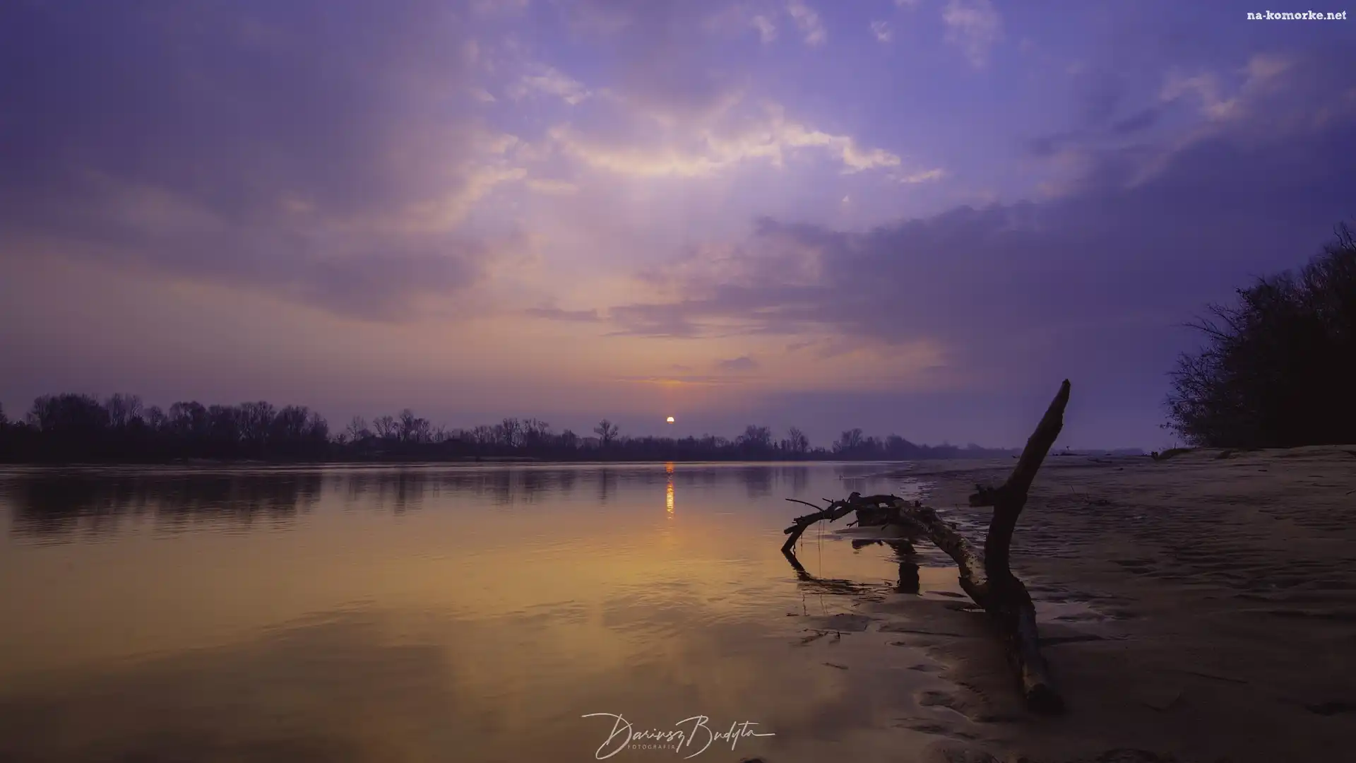 Zachód słońca, Konar, Drzewa, Jezioro na Komórkę