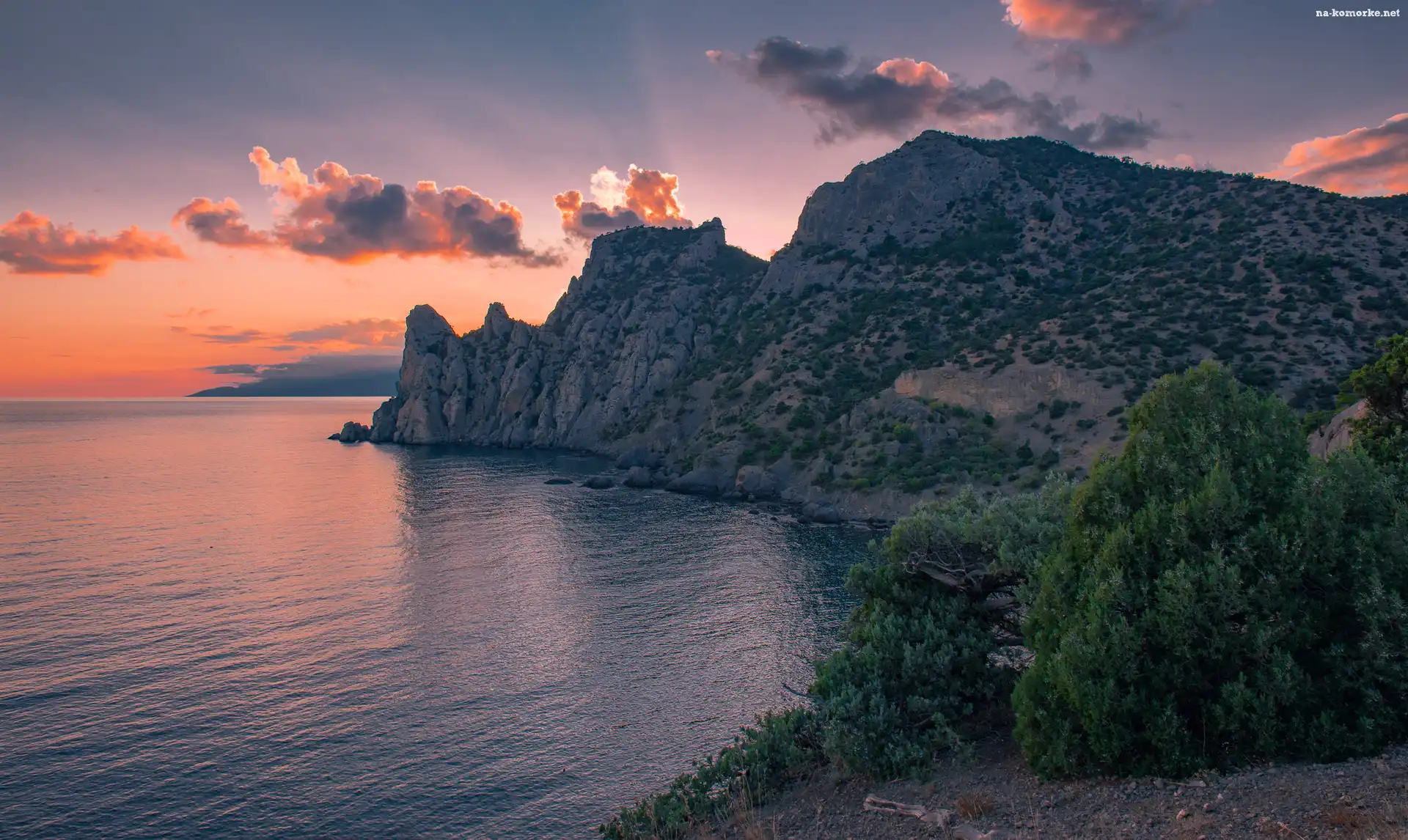 Zachód słońca, Morze, Skały, Drzewa, Chmury na Komórkę