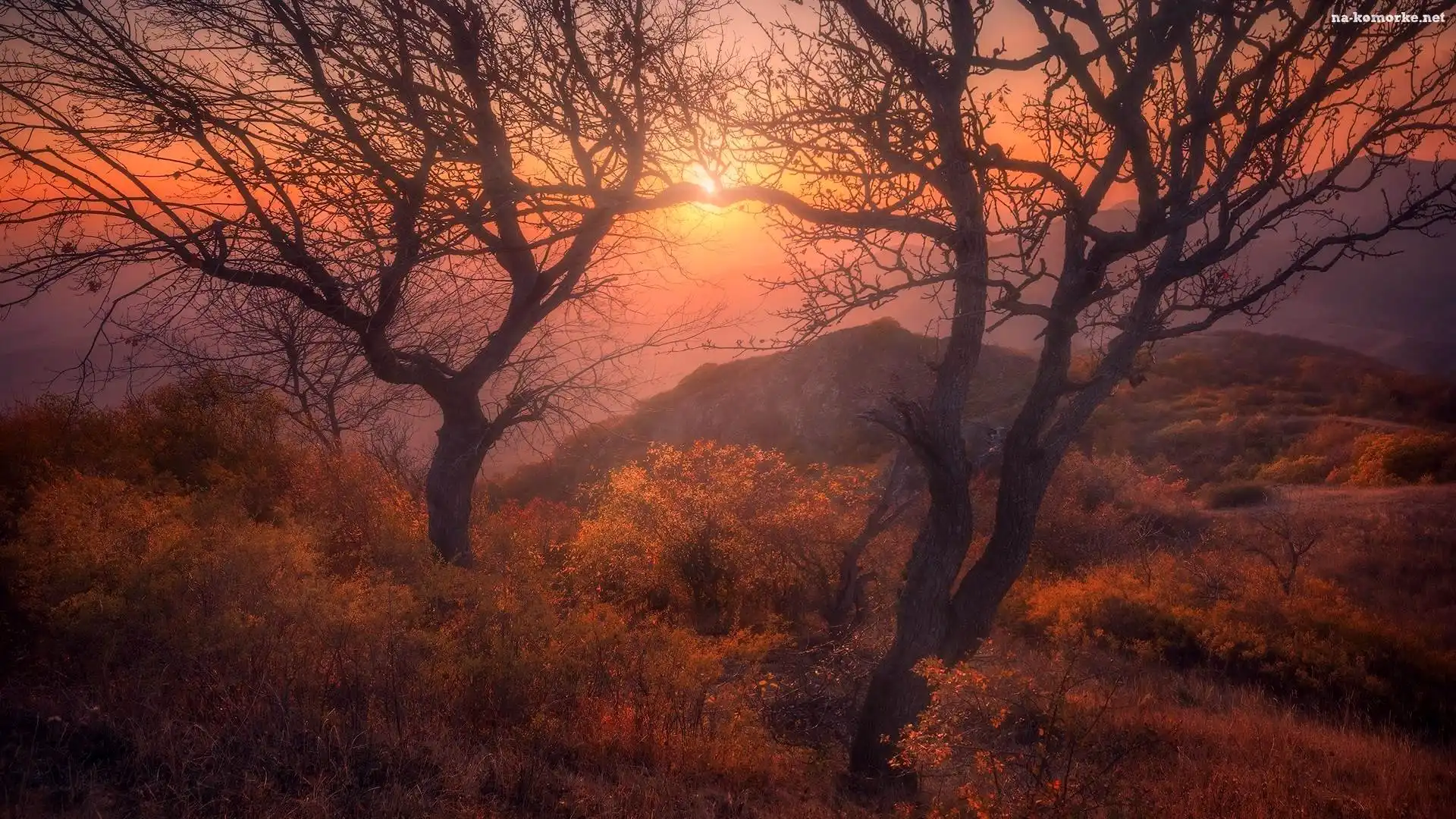 Zachód słońca, Krzewy, Góry, Drzewa na Komórkę