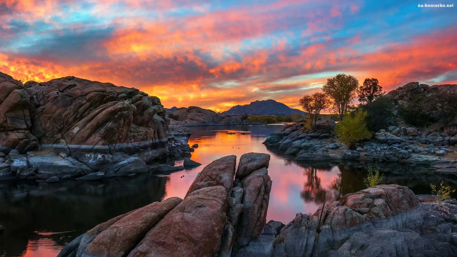 Arizona, Prescott, Granitowe, Zachód słońca, Skały, Góry, Rzeka, Drzewa, Granite Dells, Stany Zjednoczone na Komórkę |