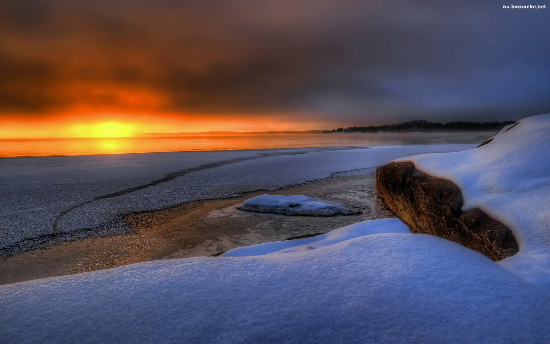 Śnieg, Jezioro, Chmury, Zachód, Słońca na Komórkę