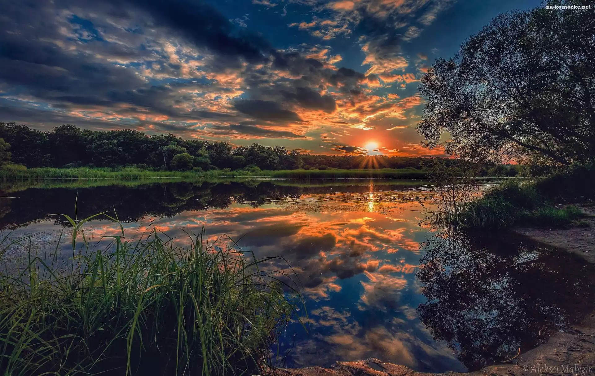 Zachód słońca, Drzewa, Jezioro, Szuwary na Komórkę