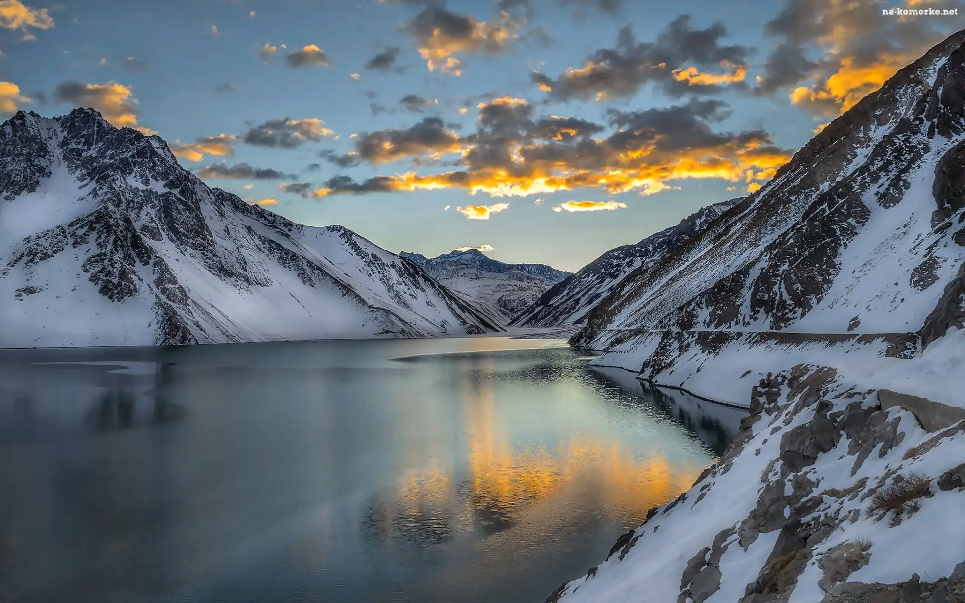 Zachód, Góry, Ośnieżone, Obłoki, Jezioro, Słońca na Komórkę