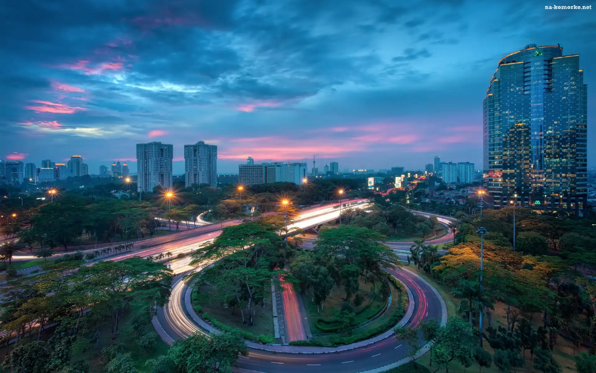 Wieżowce, Zachód, Drzewa, Słonca, Ulice, Dżakarta, Stolica, Jndonezji na Komórkę