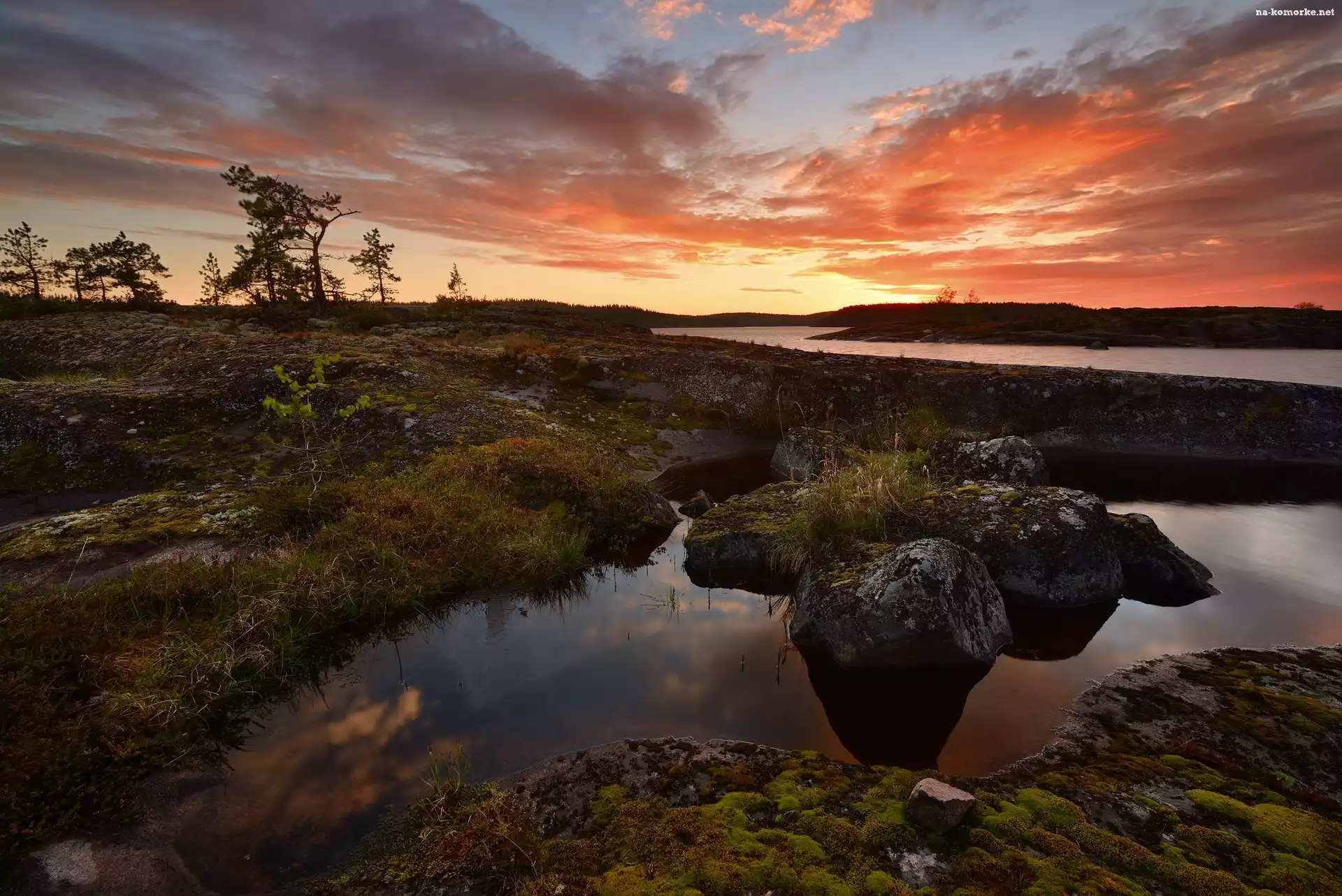 Zachód słońca, Rzeka, Drzewa, Kamienie, Chmury na Komórkę
