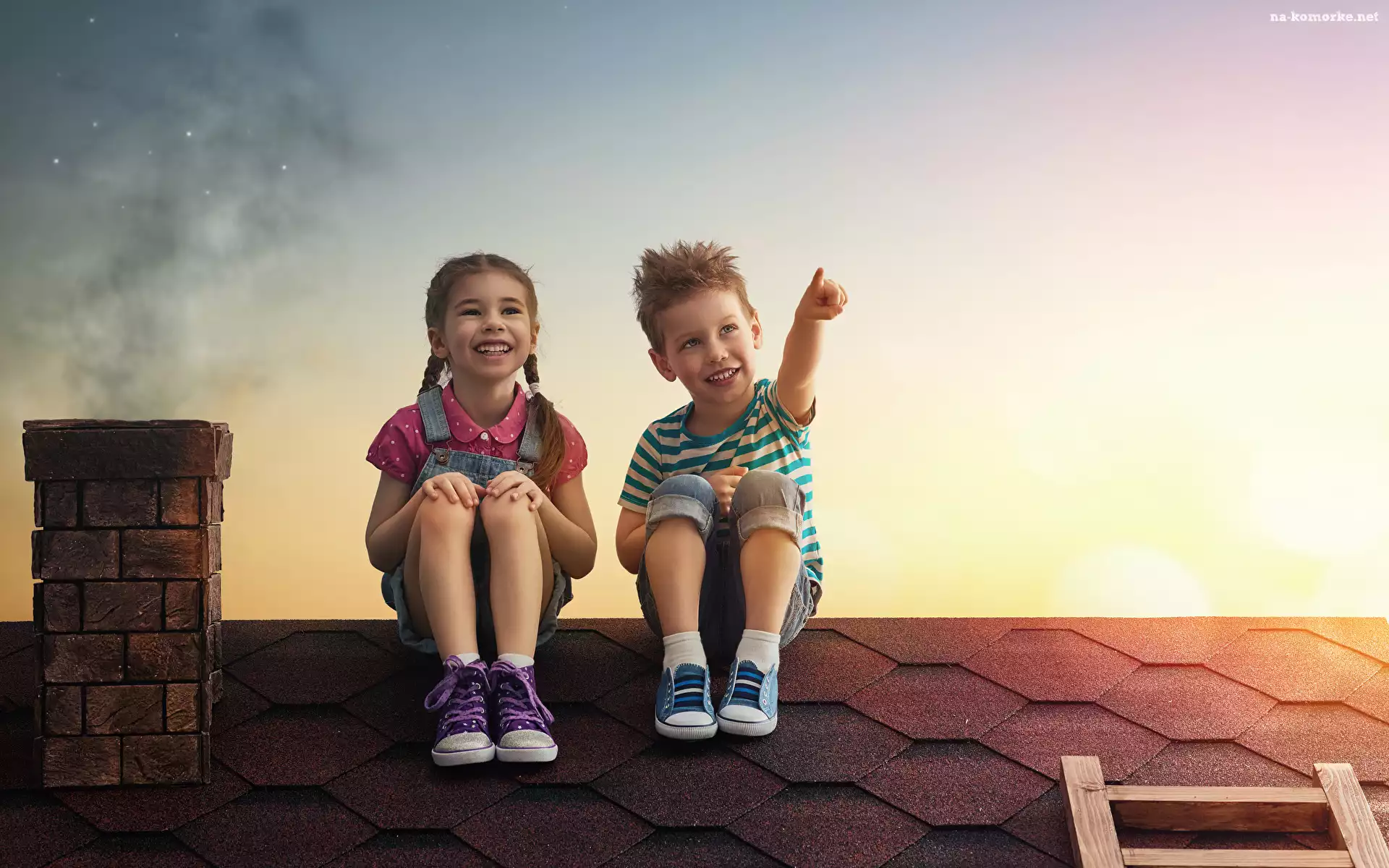 Zachód słońca, Dzieci, Dach, Komin, Dym na Komórkę