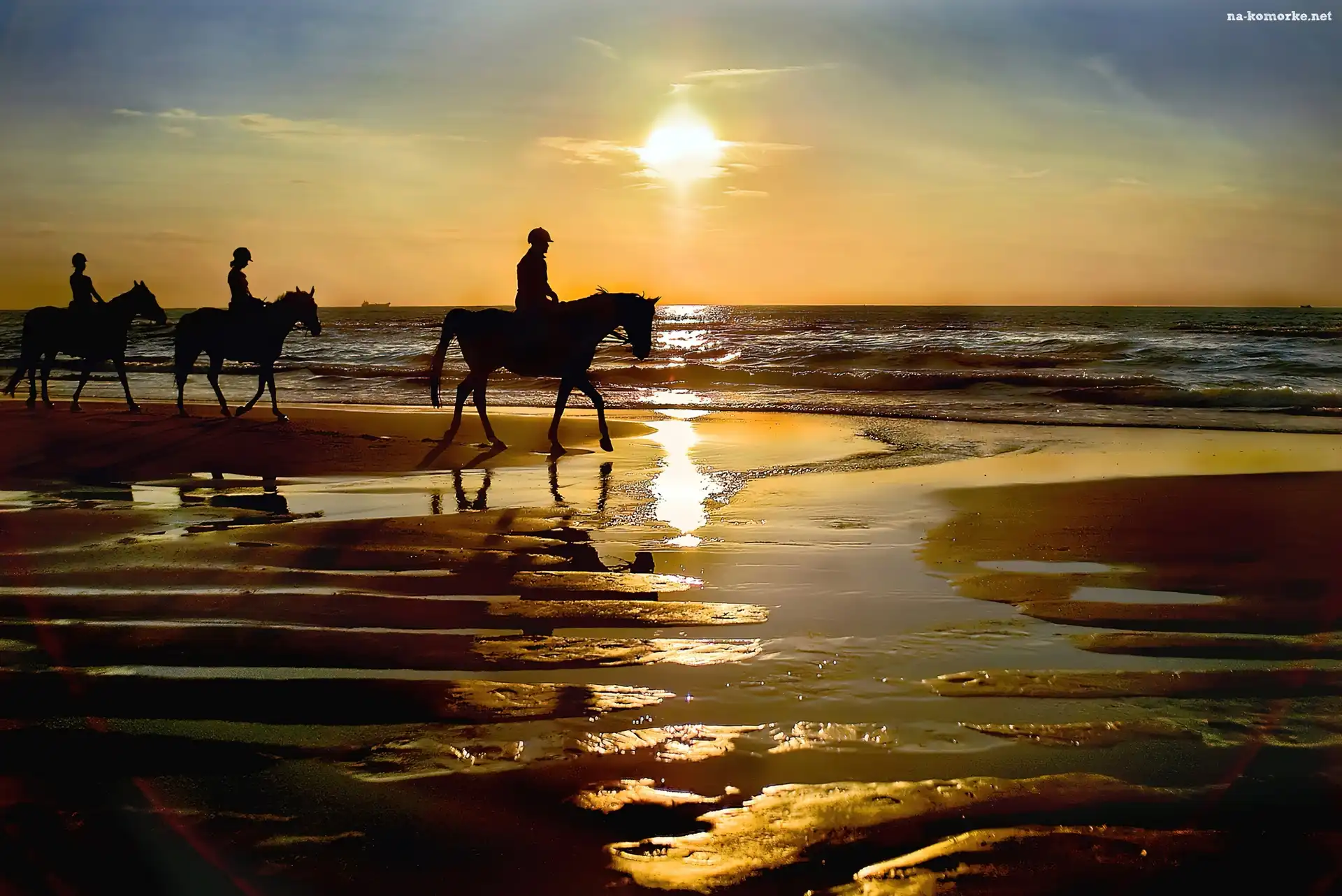 Zachód, Morze, Plaża, Konie, Dżokeje na Komórkę