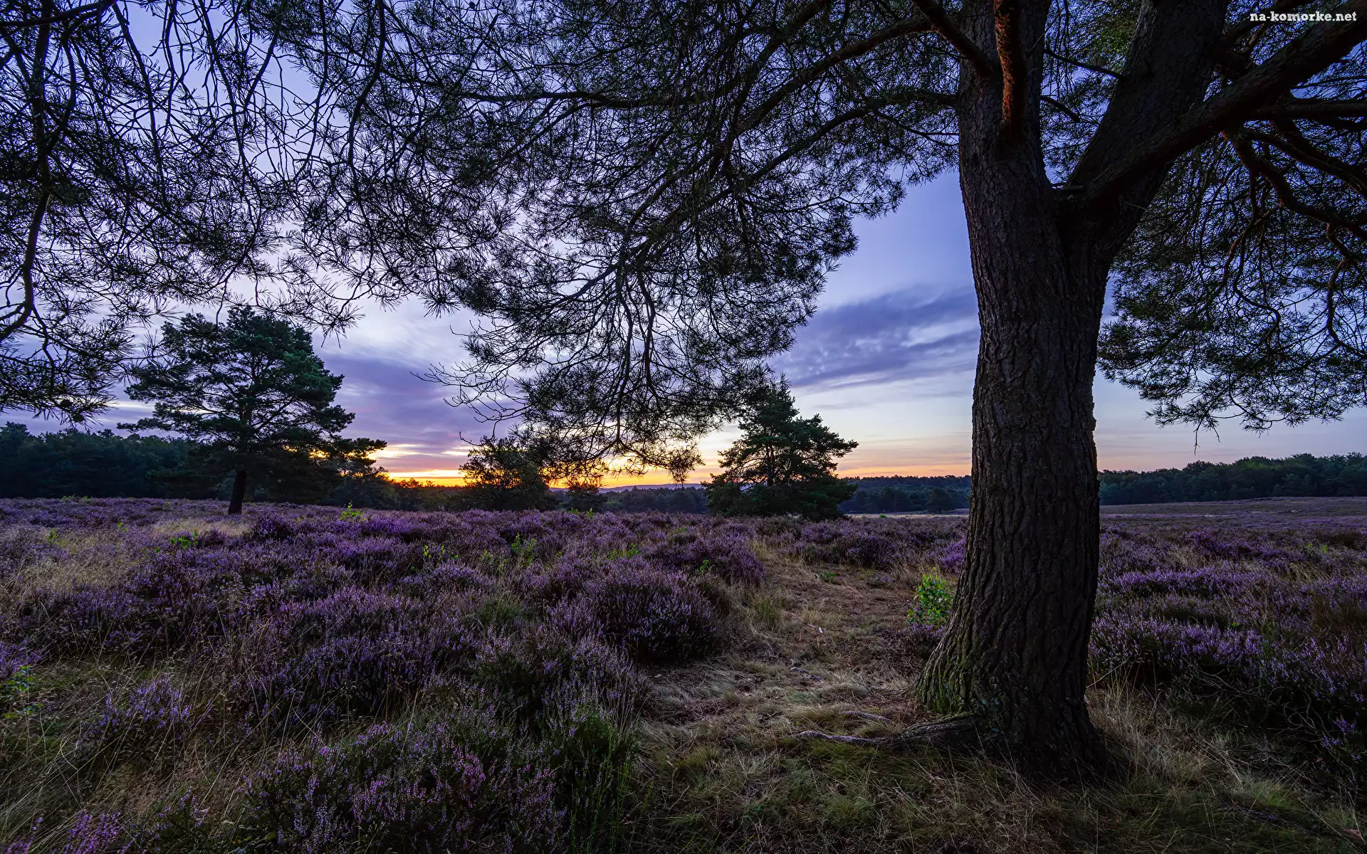 Chmury, Wrzosowisko, Las, Zachód słońca, Wrzosy, Drzewa na Komórkę