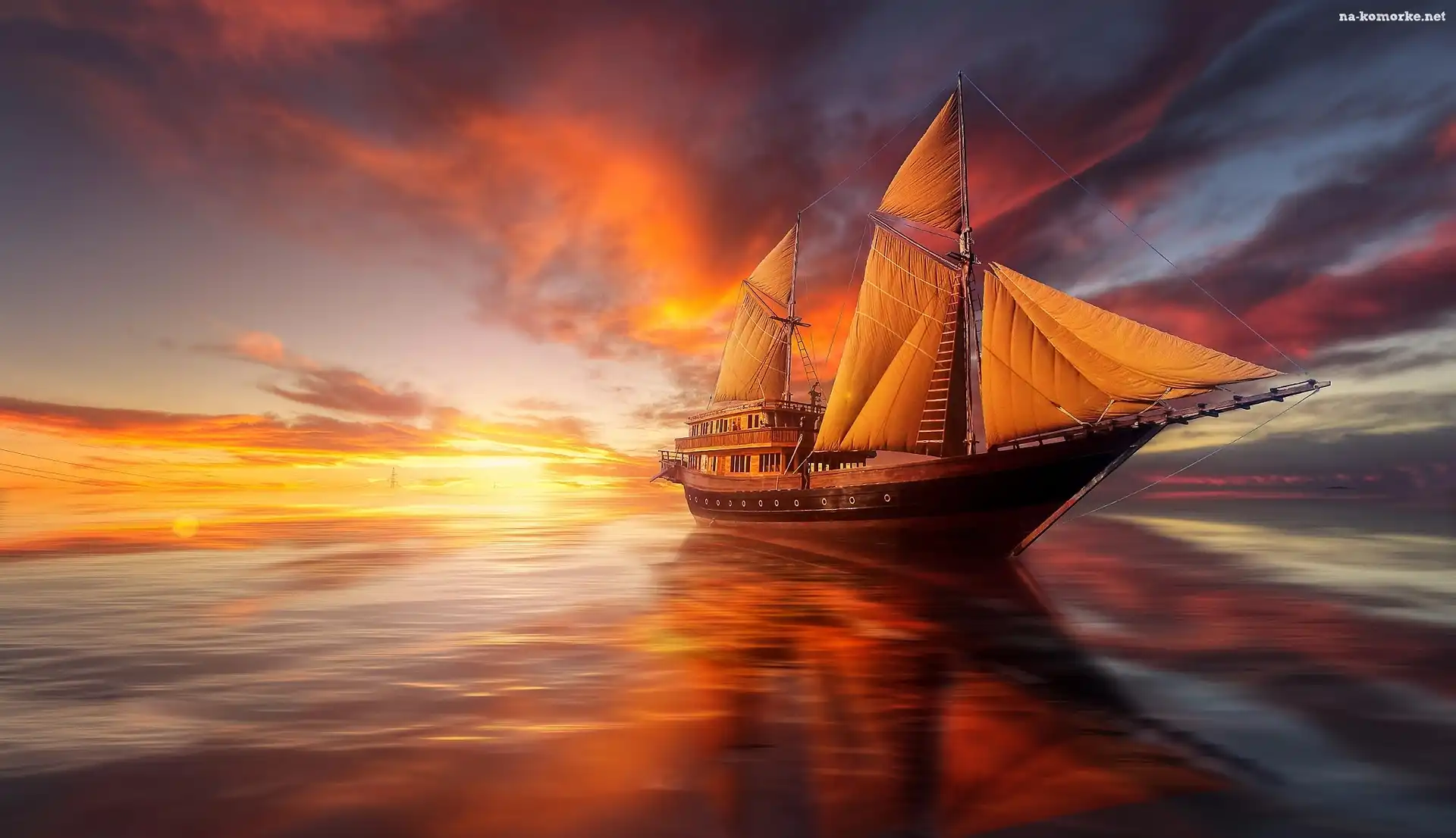 Żaglowiec, Morze, Zachód słońca na Komórkę