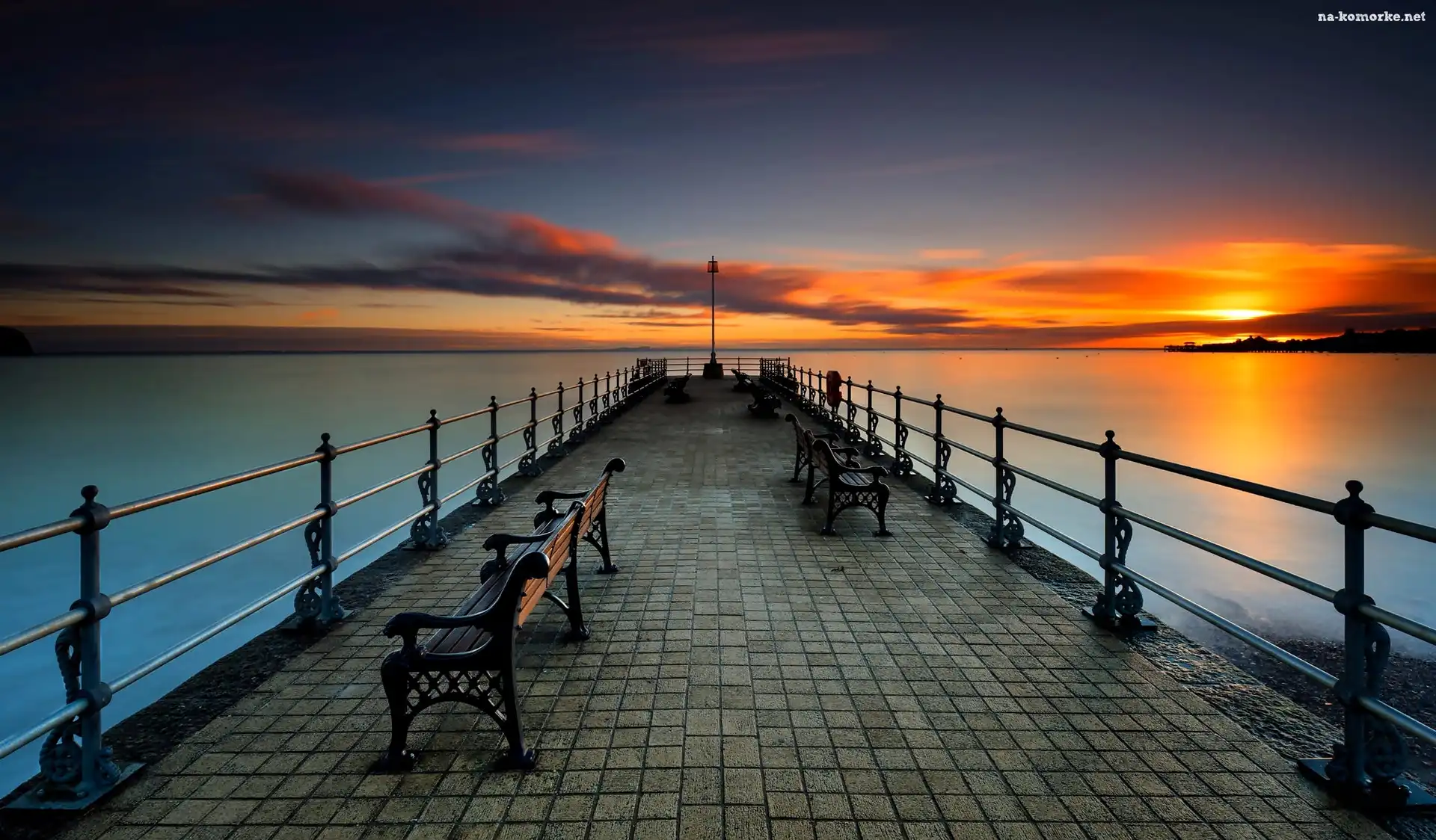 Zachód słońca, Ławki, Morze, Molo na Komórkę