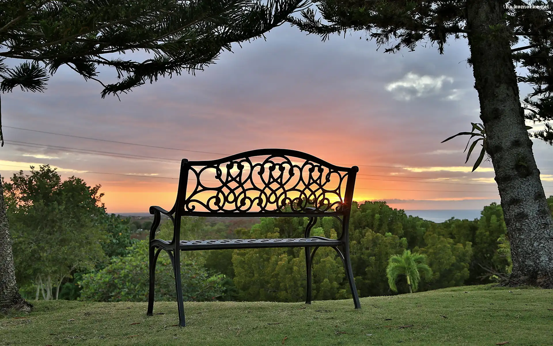 Zachód słońca, Ławka, Drzewa, Niebo, Chmury na Komórkę