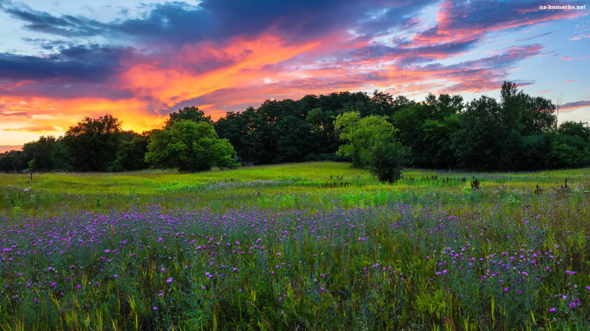Chmury, Łąka, Niebo, Zachód słońca, Drzewa, Kwiaty na Komórkę