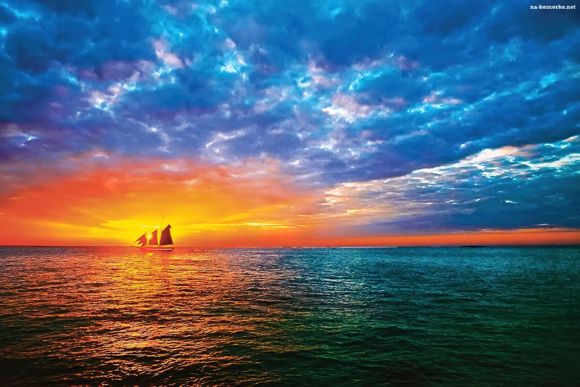 Żaglówka, Niebo, Morze, Zachód, Słońca na Komórkę