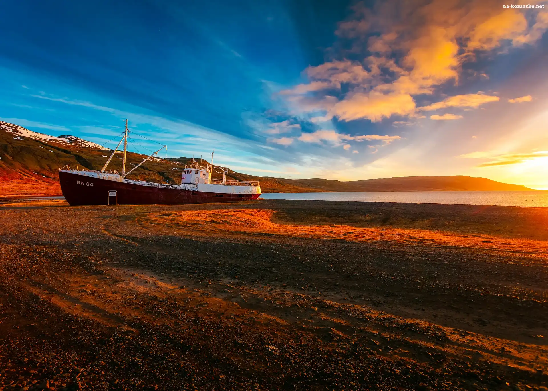 Statek, Zachód słońca, Chmury, Rybacki, Brzeg, Morza, Niebo na Komórkę