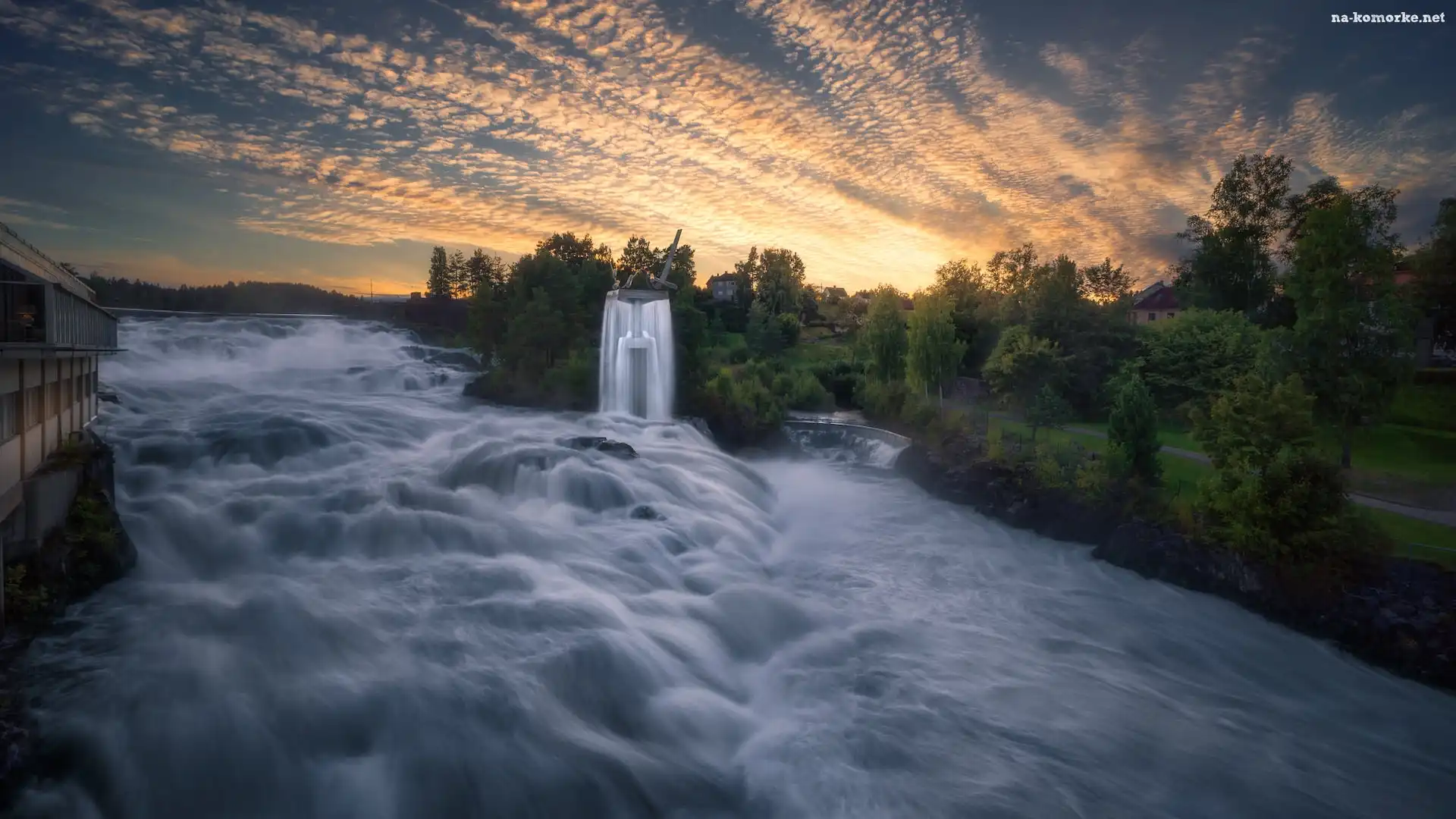 Norwegia, Zachód słońca, Wodospad Hensfossen, Drzewa, Honefoss na Komórkę