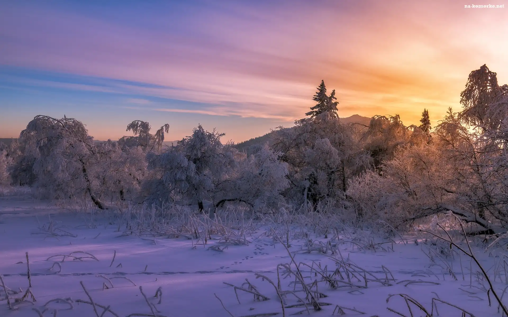 Zachód słońca, Zima, Góry, Ośnieżone, Drzewa na Komórkę