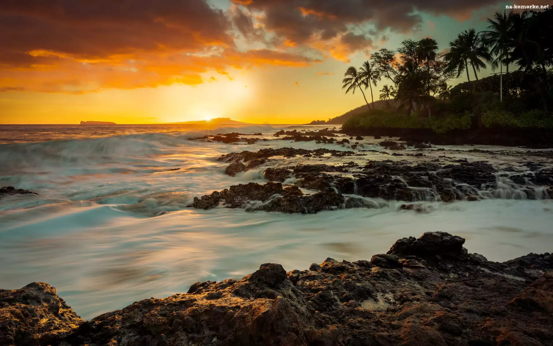Brzeg, Morze, Palmy, Zachód słońca, Kamienie, Fale na Komórkę