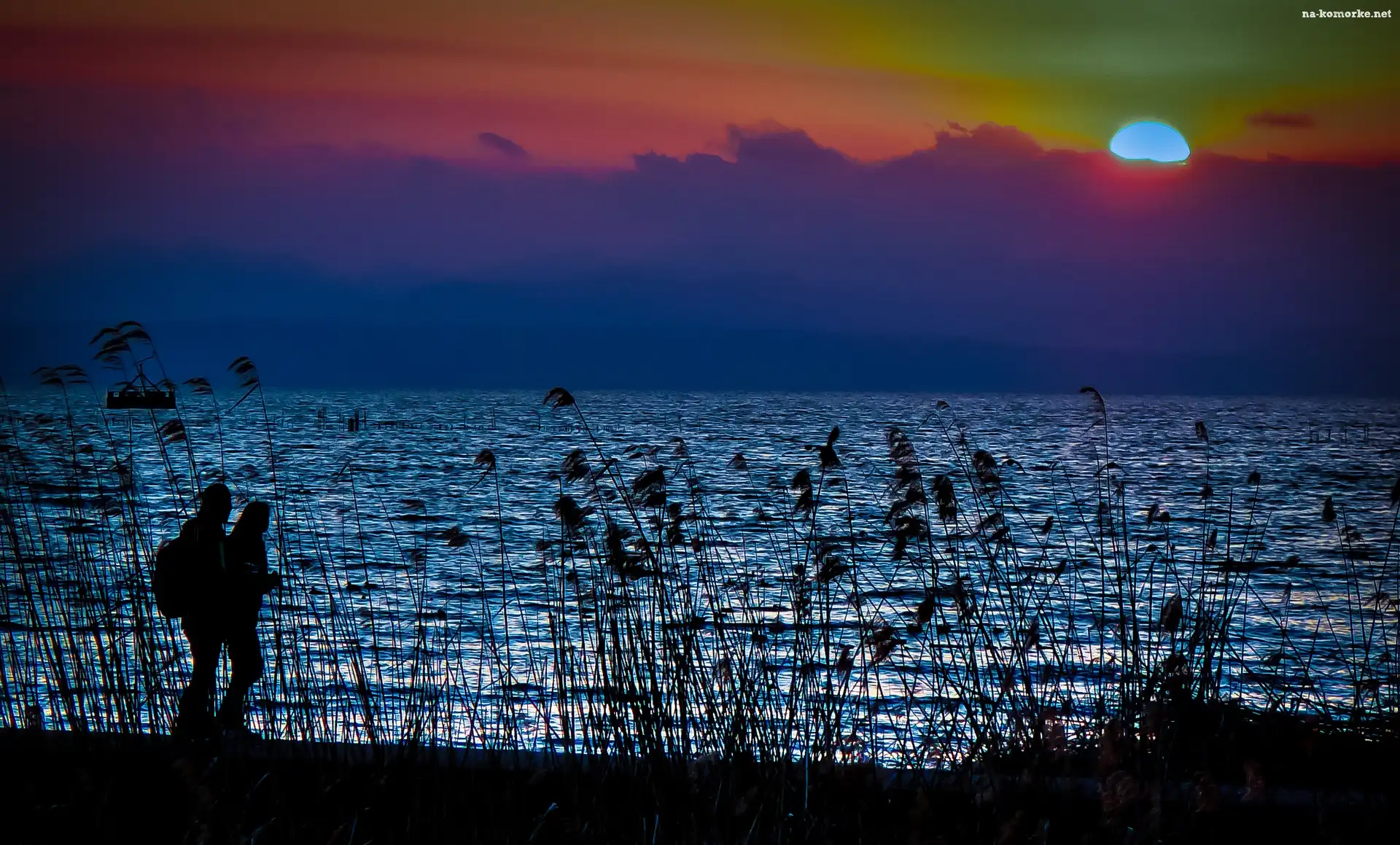 Zachód Słońca, Spacer, Jezioro, Para, Trawy na Komórkę