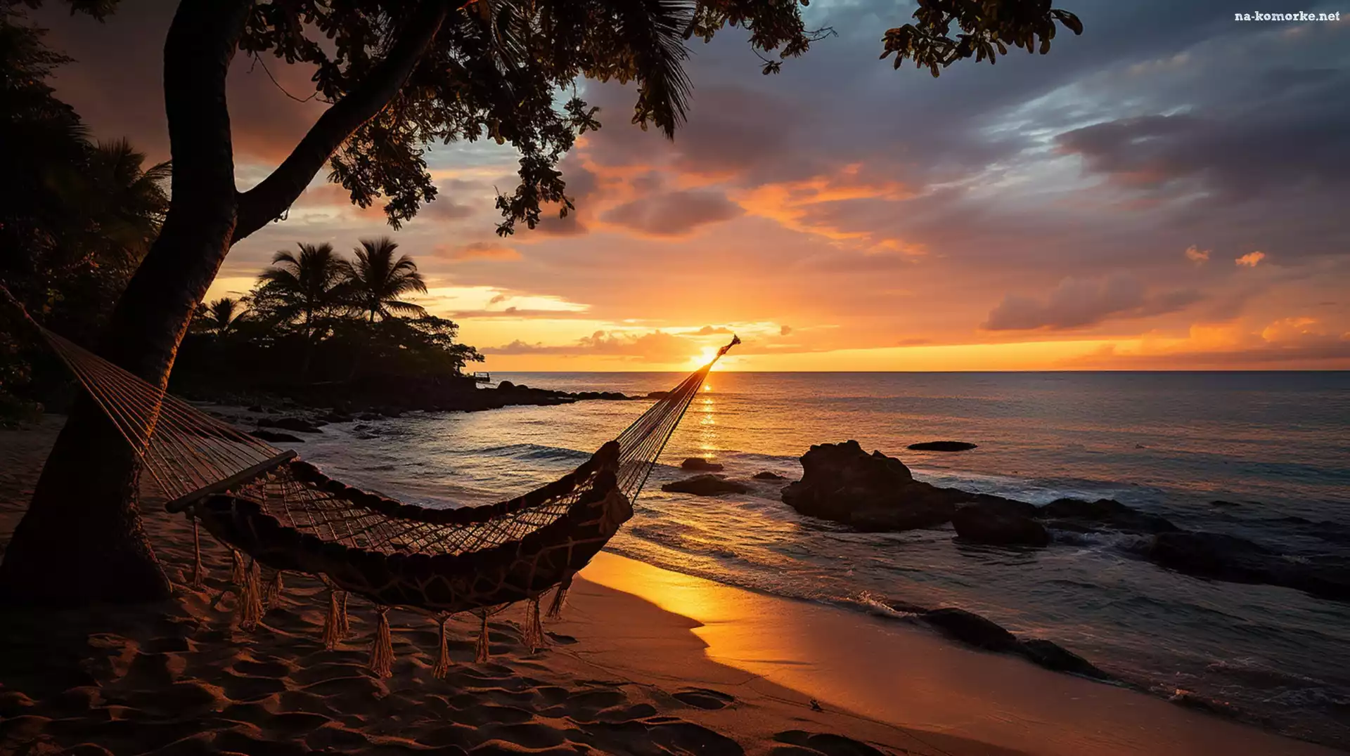 Morze, Drzewo, Hamak, Zachód słońca, Plaża na Komórkę