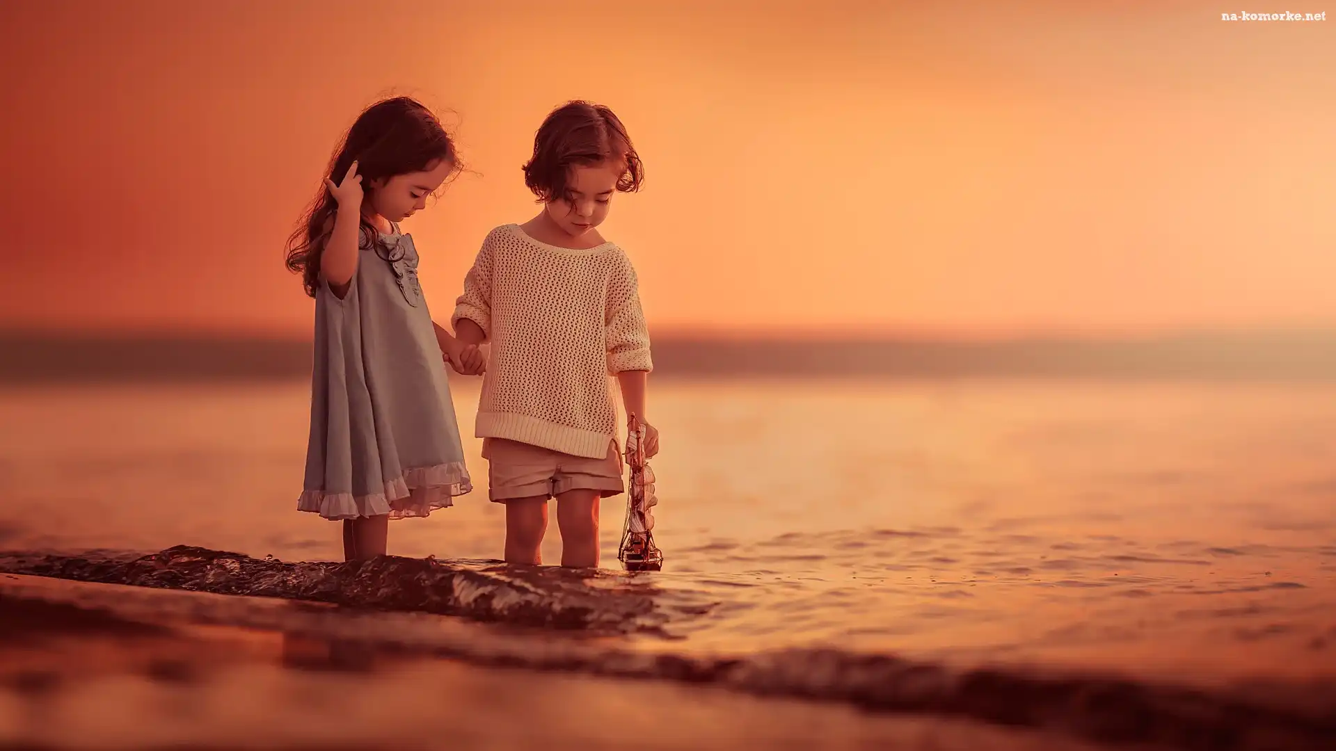 Zachód słońca, Morze, Brzeg, Plaża, Dzieci na Komórkę