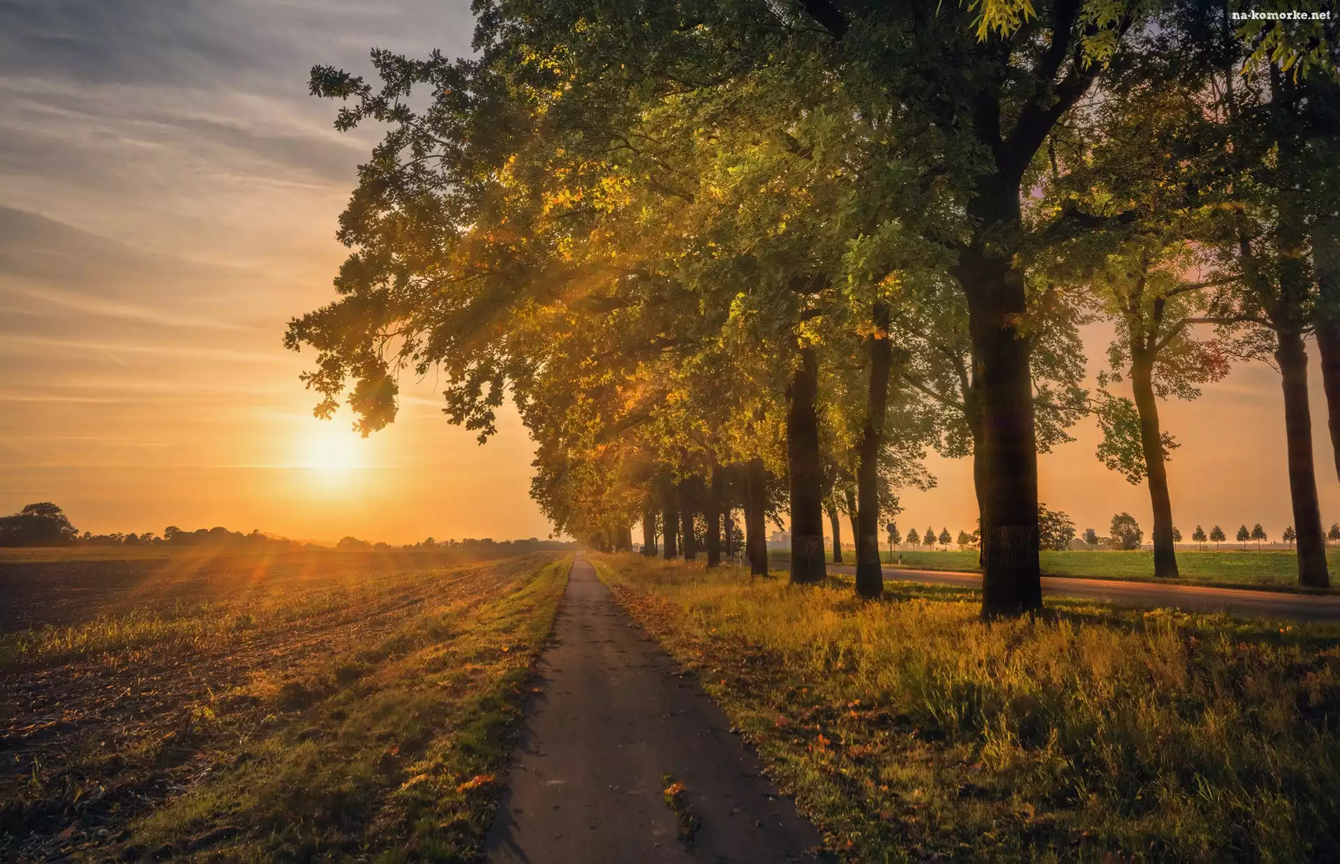 Zachód słońca, Jesień, Droga, Pola, Drzewa na Komórkę